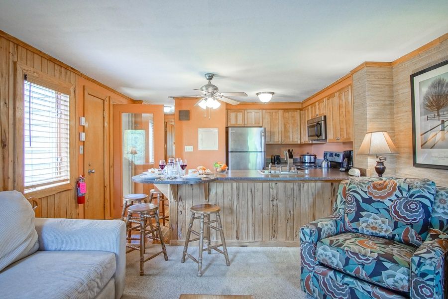 POWDERIDGE 1 - 1 BEDROOM FLAT, 1 BATH - BEDDING: QUEEN BED AND QUEEN SLEEPER SOFA - This cute and cozy Powderidge flat has a fully equipped kitchen with a microwave, dishwasher, and a full sized refrigerator. Enjoy the convenience of being in a slope side complex and a shuttle stop is out the front door that will take you to the Village, slopes at Soaring Eagle, and Silver Creek (skiing, night skiing, and tubing). Wood Fireplace (wood provided); Washer/Dryer; Dishwasher; Stereo/CD; TVs, DVD/VCR, and Balcony.