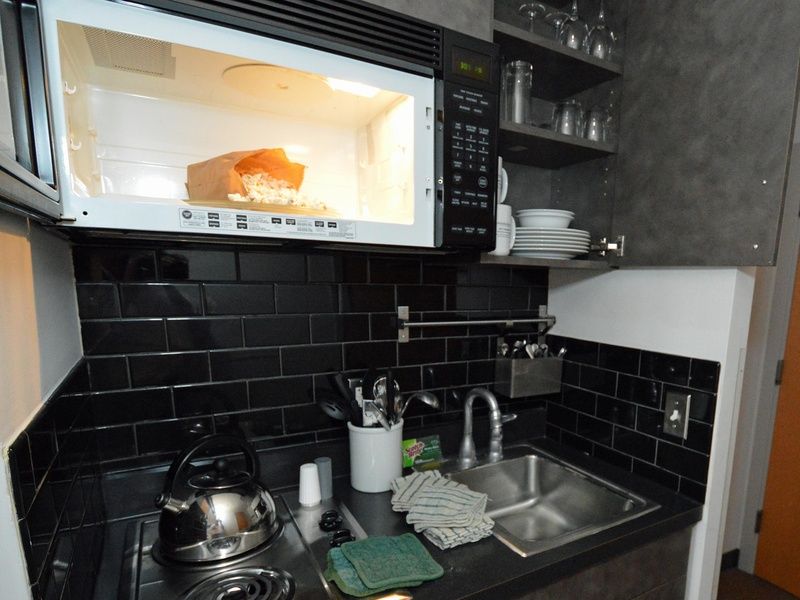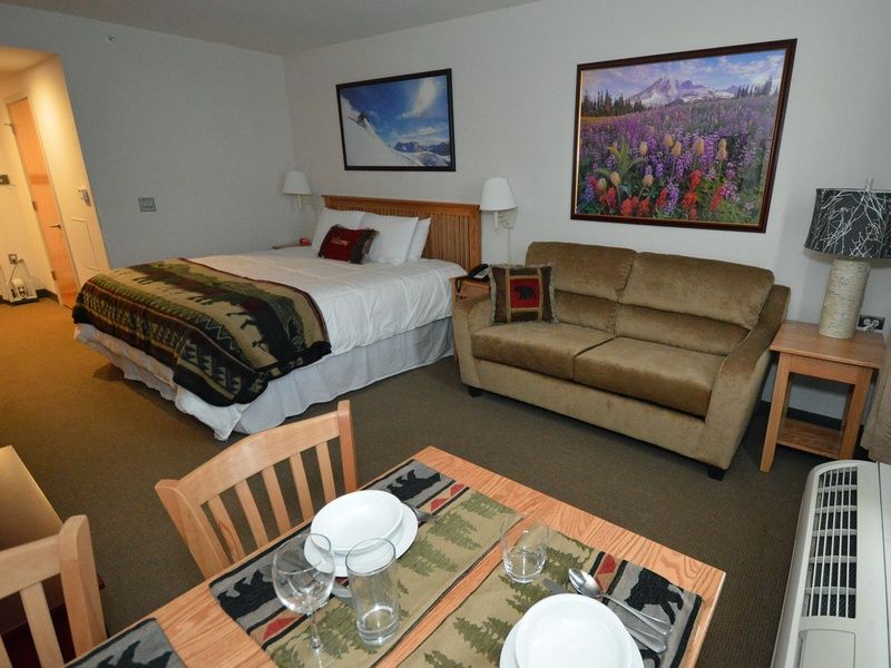 Expedition Station 308 - 1 Bedroom Studio - BEDDING: Pillow top King Bed. 60" Samsung HDTV SmartTV, with BluRay DVD; Full Bath. Table for 4. Wine Cooler, Mini Kitchen suitable for light breakfasts and lunches. Microwave oven, under-counter refrigerator, 2 burner cooktop, NO OVEN. Fantastic mountain and ski trail views. Watch the sunrise every morning. Convenient location in the Village next door to Ski and Snowboard School, shops, and restaurants.