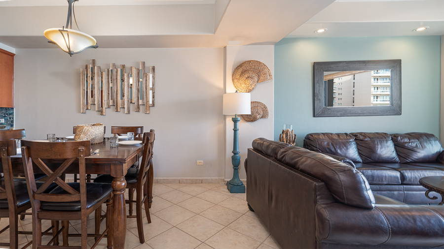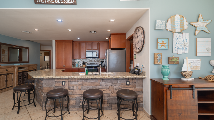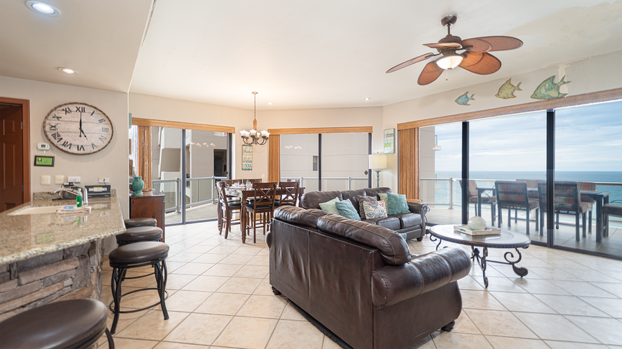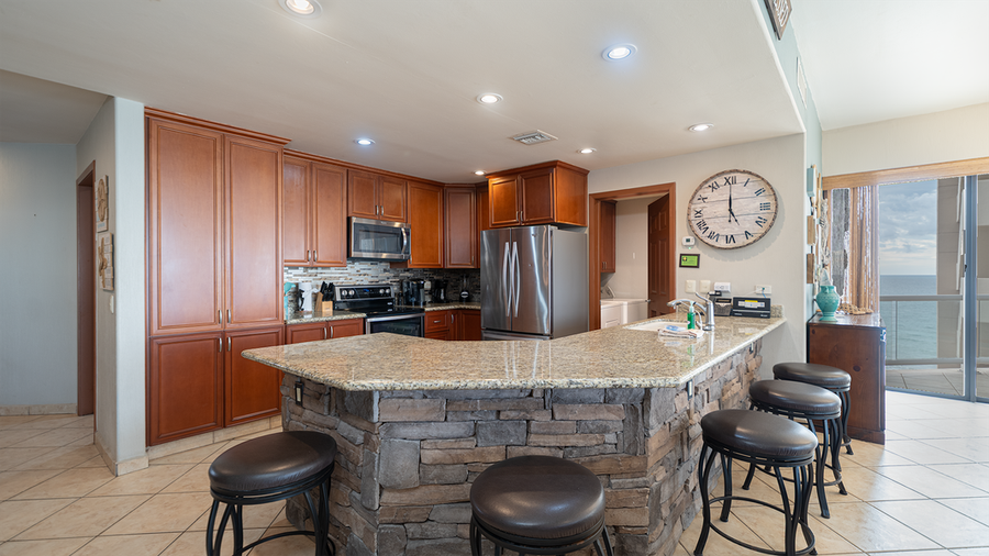 Topaz 808 presents three bedroom, all set in luxurious furnishings. The main room has multiple sliding glass doors, allowing the views and a lot of light to stream in. There is a raised dining table for six here. The living room den has two leather sofas and a TV. Bar stools ling the massive kitchen counter. Int eh kitchen you find everything that any aspiring chef could want.