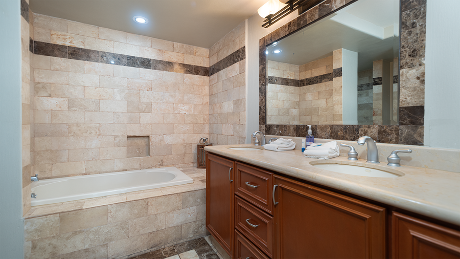 The main bedroom has a king sized bed, an attached bathroom with shower and separate bathtub. The second bedroom serves as a private suite, and has its own bath with incredible views! Bedroom three has a king bed, closet, and TV.
