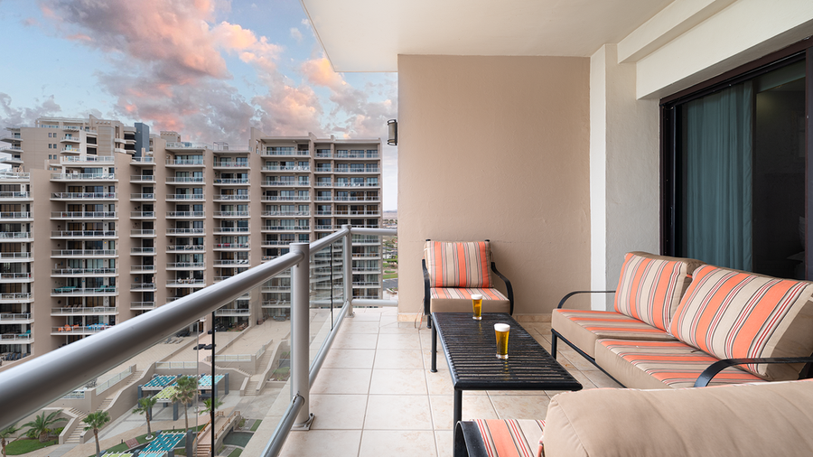 High end luxury in this three bedroom end unit at Las Palomas Beach and Golf Resort Views to the ocean, as well is the golf course. Private balcony for the ensuite bedroom. The Resort boasts the best mix of amenities, right along Sandy Beach. Enjoy popular dining options at on-site La Maria, and Citron Restaurants. There is Rocky Points best coffee shop, Coffee point right on-site as well. There is under ground parking, fiber optic Wifi, full gym, and convenience store too. Near the beach are fun water options like a lozy river, and aquarium bar, large negative edge pools, and more intimate pools for a relaxed feeling too.
