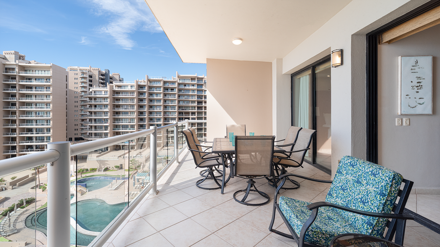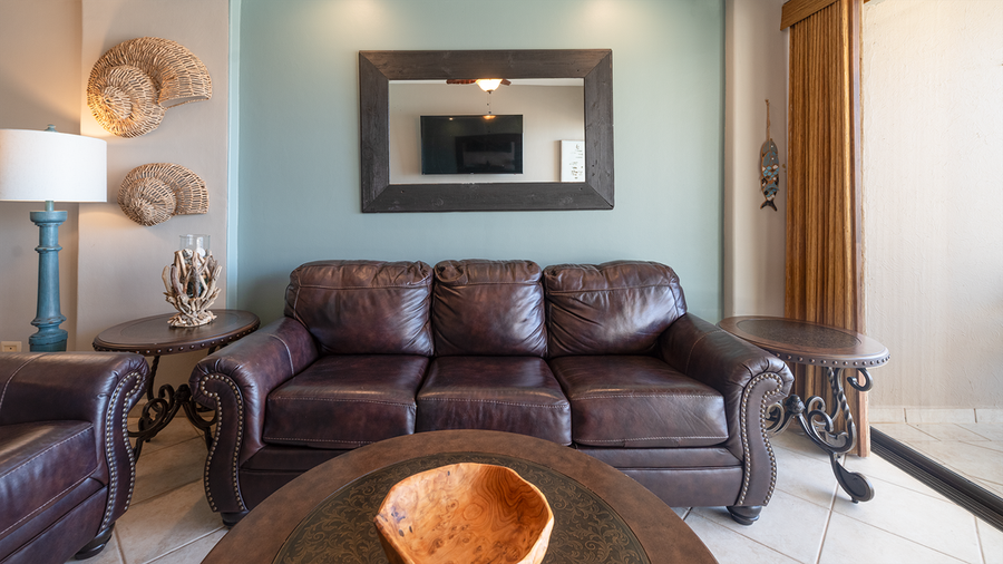 Experience a world of fun at the beach. Diamante 702 at Las Palomas Beach and Golf Resort is the way to go for the best in an accessible Mexican coastal getaway. This two bedroom condominium, elegantly furnished with an eye towards luxury, presents one of the best options for enjoying Sandy Beach in Rocky Point. The main room combines great leather seating, TV, and balcony access, along with a dining table for six.