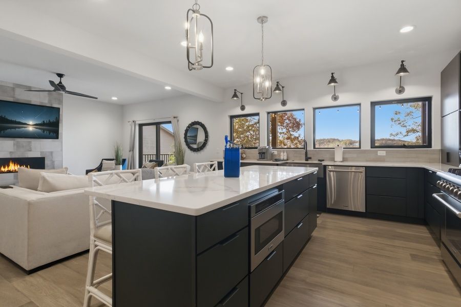 Welcome to Casa Solstice, a bright, newly built lakefront getaway tucked in a cove at the 9mm in Lake Ozark. Enjoy multiple deck levels overlooking the lake and a private dock with boat and PWC slips for amazing lake days. Step into the lush interiors with modern decor, multiple stylishly designed guest rooms, and ample space for relaxation and play in the open living and recreation rooms. With tons of the lake's favorite hot spots nearby, Casa Solstice is sure to be your favorite lake getaway! Great Space and Accommodations for Sleep, Dining, Gathering, and Enjoyment: - Open-concept living room blends with the kitchen and features large sliding doors that walk out to the deck - Fully equipped kitchen with modern appliances, cookware, and dining essentials, and seating for up to 8 at the table and 10 at the island. - Three levels of lakeside deck overlook beautiful sunsets and sunrises each day - Basement recreation area with ping pong and foosball tables - Private dock with 10x20 boat slip, 2 PWC slips, lake access and a swim ladder - Lower deck featuring a gas firepit, couch seating and lake views Outdoor Enjoyment at the Lake: You will love spending time outdoors with private lake access and a single-well dock with PWC slips and swim ladder, perfect for swimming, fishing, or lounging by the water. The quiet cove provides a safe and peaceful setting for families. Gather on the lower deck by the gas firepit for cozy evenings, eat outdoors on the main level deck, or walk out from the upper-level king suites and relax on the upper deck to take in beautiful lake views. Ample seating makes this an ideal spot for sunset watching and lakeside gatherings. Indoor Comfort and Entertainment: Inside Casa Solstice, unwind in a bright open-concept living area with plush seating and a smart TV. The fully equipped kitchen makes preparing meals easy, and the basement recreation area with ping pong and foosball tables offers hours of fun. This newly built home is designed for both comfort and connection—perfect for family retreats and group getaways. Nearby Activities and Attractions: Located near the 9 Mile Marker on the main channel of Lake of the Ozarks, Casa Solstice is close to many of Lakes’ top attractions by both land and water. Enjoy waterfront dining at Dog Days Bar and Grill, Backwater Jack’s, Jolly Rogers, Lake Burger, and Redhead Lakeside Grill. Explore the Bagnell Dam Strip for shopping, live music, and nightlife, or spend a day at Osage Beach Outlet Marketplace. Golf lovers can tee off at Bear Creek Valley Golf Club or The Ridge. From boating and dining to family fun and endless entertainment, everything you need for an unforgettable lake vacation is nearby. Other Things to Note: - We supply propane for the grill and fire pit. - This property is accessed through paved roads. Drivers may encounter steep hills and narrow roadways. Please use caution while navigating. In winter, roads may ice over and become difficult to drive on. - The minimum age to book this property is 25 years old, and it is best suited for families and groups of friends. - This property welcomes responsible gatherings; excessive noise or parties are not permitted. Exclusive to Your LakeDays Rentals Stay: Pack Less Program™ offers full stock service in paper products, toiletries, spices and oils, coffee amenities, and more. LakeDays by Design™ offers personalized recommendations for your group based on interests, ages and budget. For Your Safety and Peace of Mind: - A video/audio doorbell at the entry for secure access - Decibel measuring devices installed indoors and outdoors to maintain noise control standards - Smart lock systems for timed guest access, ensuring safety and convenience - An interior communication panel for Z Wave connection with locks and video doorbell, with no interior video/audio monitoring About Your Host: LakeDays Rentals - Casago is dedicated to offering intentionally crafted lake experiences at Lake of the Ozarks. In partnership with owners who are equally committed to providing amazing vacation stays, our team prioritizes your experience, from pre-arrival inspections to personalized services. With a deep love for the lake and an insider’s perspective on its hidden gems, we’re here to ensure your lake vacation creates lasting memories. We’re honored to serve as your hosts for an exceptional lakeside adventure. Cancellation Standards: Any cancellation completed with a refund will have a 5 percent transaction fee for the processing of the refund. Therefore, the refunded amount will equal 95 percent of the transaction paid. Casago - Lake of the Ozarks has engaged VacayHome to ensure this listing contains all the information you need and that it is easy for you to book via search engines & online channels. VacayHome is connected directly to the property management system used by Casago - Lake of the Ozarks which ensures that availability & rates are up-to-date & accurate. When you book, VacayHome processes payment on behalf of Casago - Lake of the Ozarks and a charge will appear on your statement as "VacayHome". VacayHome will send you a confirmation e-mail that contains all the information you need to prepare for your vacation including arrival instructions. VacayHome has a 24 x 7 team to assist you with any questions or concerns you may have prior to arrival. To access VacayHome, obtain the customer support telephone number or read FAQs, please click on the links at the bottom of this page.
