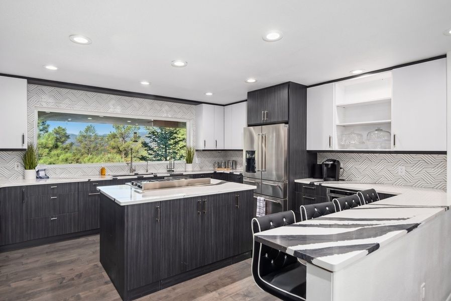 The gourmet kitchen is a showpiece of its own, fully outfitted with high-end stainless steel appliances, an oversized gas range, beautiful countertops, and a massive picture window that showcases the pines as you cook. A smartly designed breakfast bar and adjacent dining area ensure there is plenty of room for everyone to dine, snack, or sip morning coffee while taking in the peaceful views. Just off the living room, a spacious covered deck extends the living space outdoors, offering two full outdoor tables, a grill, and sweeping sightlines, perfect for evening meals or quiet mornings in the crisp alpine air.