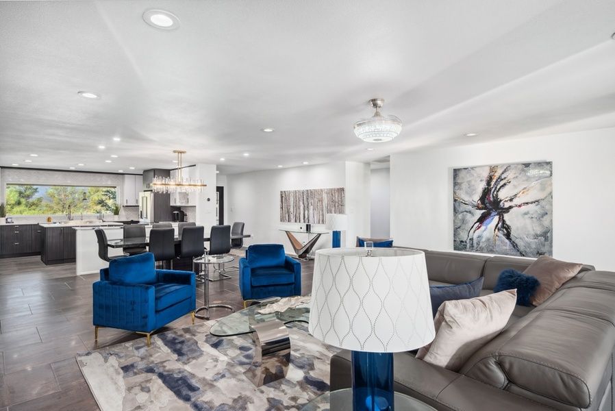 Welcome to your modern mountain escape! This single-level luxury retreat delivers an exceptional blend of modern design and mountain serenity. From the moment you arrive, the home’s clean exterior lines, front deck, and panoramic forest backdrop set the tone for a stay defined by comfort and style. Inside, the open concept living area is anchored by a sleek gas fireplace and surrounded by floor-to-ceiling windows that frame the surrounding mountain scenery. Contemporary furnishings, bold artwork, and plush velvet accents create a warm and inviting atmosphere, while multiple seating areas allow your group to spread out, relax, or gather together with ease.