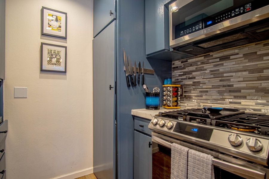 The open-plan living area is ideal for gatherings, featuring a contemporary sofa and chairs, a modern gas fireplace, and a large flat-screen TV. The dining area comfortably seats all guests, stainless steel appliances, a gas range, tile countertops, and a breakfast bar with seating for three.
