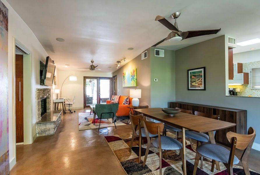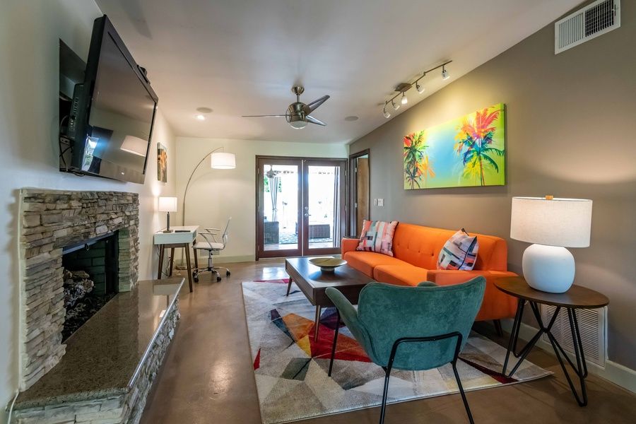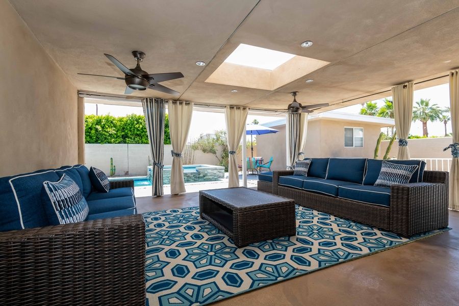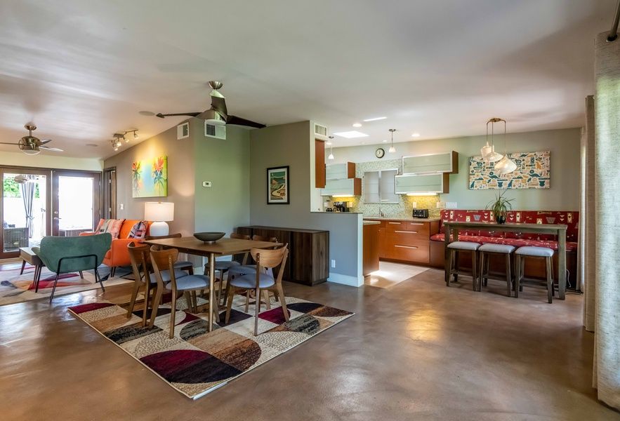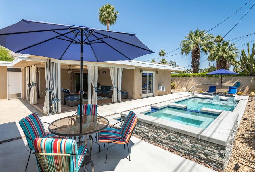 29-Night Minimum Rental Welcome to your mid-century Palm Springs escape—an inviting retreat blending 1950s charm with modern comfort. With multiple indoor/outdoor living areas and a private casita overlooking the pool, this home is designed for relaxation and connection. Highlights • Mid-century 3BD/3BA home with classic 1950s architecture • Private attached casita with full kitchen, bathroom, and workstation • Brand-new heated pool and spa • Multiple outdoor living spaces with mountain views • Quiet Demuth Park neighborhood • Dog-friendly (no cats) The Space Step into a beautifully preserved mid-century home where classic Palm Springs design meets modern convenience. The open-concept living, dining, and kitchen area provides a bright, welcoming space to gather, complete with a cozy fireplace for cool desert evenings. The home includes two king bedrooms in the main house and a separate private casita—ideal for guests seeking added comfort and privacy. Large windows and sliding doors create seamless transitions between indoor relaxation and outdoor enjoyment. Sleeping Arrangements • Primary Bedroom (Main House): King bed / En-Suite bathroom / Mid-century accents with plenty of natural light • Guest Bedroom (Main House): King bed / Access to full bathroom • Private Casita: Queen Murphy bed / Full kitchen / Private bathroom / Separate entrance Outdoor Living Enjoy true desert living with thoughtfully designed outdoor spaces for every part of the day. The brand-new heated pool and spa serve as the centerpiece, surrounded by loungers and a covered lounge area perfect for afternoon shade. Out front, a private yard with mountain views is ideal for slow mornings with coffee, while tucked-away seating areas offer quiet spots for evening cocktails. Whether you're sunbathing, swimming, or unwinding under the stars, the outdoor areas are made for relaxation. Location Located in the peaceful Demuth Park neighborhood, this home offers a serene escape while staying close to the best of Palm Springs. You're just minutes from the airport, downtown dining and shopping, local golf courses, hiking trails, and the scenic Demuth Park loop. Convenience meets tranquility in this easygoing desert retreat. Pool Heat Ensure a comfortable swim with optional pool heating, available upon request at booking or before your arrival. The pool is heated to 87º from 7 AM to 7 PM throughout your stay. Rates vary by season: • November–March: USD75/night • April, May, October: USD50/night • Not needed in other months For stays under 7 nights, pool heat must be purchased for the entire stay—we cannot heat it for select days. A 24-hour notice prior to your arrival is required to ensure optimal warmth on your first night. Heating begins the day before your arrival at no extra charge. Hot Tub Indulge in the ultimate relaxation with our hot tub, conveniently heated at your fingertips using a remote control. Please note that the hot tub is not pre-heated before arrival, but worry not—there's no extra charge (even if not opting for pool heat) to enjoy its warmth. Simply activate it whenever you desire, creating the perfect atmosphere for a soothing soak during your stay. Summer Utility Surcharge For stays of 29 nights or longer between June 1st and September 31st, a USD750/month utility surcharge will apply to help cover the additional energy costs associated with cooling the home during the summer heat. Dog Fee Information (up to 2 dogs/stay) There is a USD199/dog/stay fee. Simply include the number of dogs that will be joining you and the fee is automatically included in your rate. We ask that you pick up after your pet if they relieve themselves in the yard. Signs of extensive pet damage, could result in additional fees. Any signs of pets on the property without our knowledge will incur an additional USD500 fee. Sorry not feline friendly. Additional Policies & Rules • No outdoor music. Doors must be closed if playing music within the house. • 100% quiet hours outside from 10pm-10am • No smoking inside home • Renter must be 25+ years of age • Guests will sign a Ryson "Terms and Conditions" form and City Ordinances require a copy of your ID to Ryson prior to the day of your arrival. Ryson Vacations has engaged VacayHome to ensure this listing contains all the information you need and that it is easy for you to book via search engines & online channels. VacayHome is connected directly to the property management system used by Ryson Vacations which ensures that availability & rates are up-to-date & accurate. When you book, VacayHome processes payment on behalf of Ryson Vacations and a charge will appear on your statement as "VacayHome". VacayHome will send you a confirmation e-mail that contains all the information you need to prepare for your vacation including arrival instructions. VacayHome has a 24 x 7 team to assist you with any questions or concerns you may have prior to arrival. To access VacayHome, obtain the customer support telephone number or read FAQs, please click on the links at the bottom of this page.