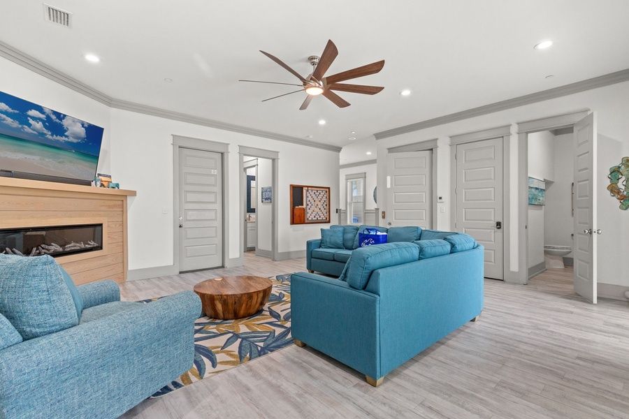 Step inside and feel instantly at ease. Bright coastal décor, an open-concept layout, and multiple gathering spaces make it easy for everyone to relax and reconnect. The kitchen is fully equipped for big meals, while the spacious living and dining areas set the scene for movie nights, cocktails, and shared memories. Thoughtfully designed sleeping arrangements ensure everyone has a comfortable place to land.
