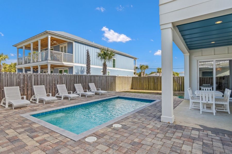 Outside, your private oasis awaits. Spend sun-soaked afternoons around the sparkling private pool, grill out on the patio, or sip your favorite drink under the warm coastal sky. With five full bathrooms and two half baths, getting ready is a breeze for even the largest groups.