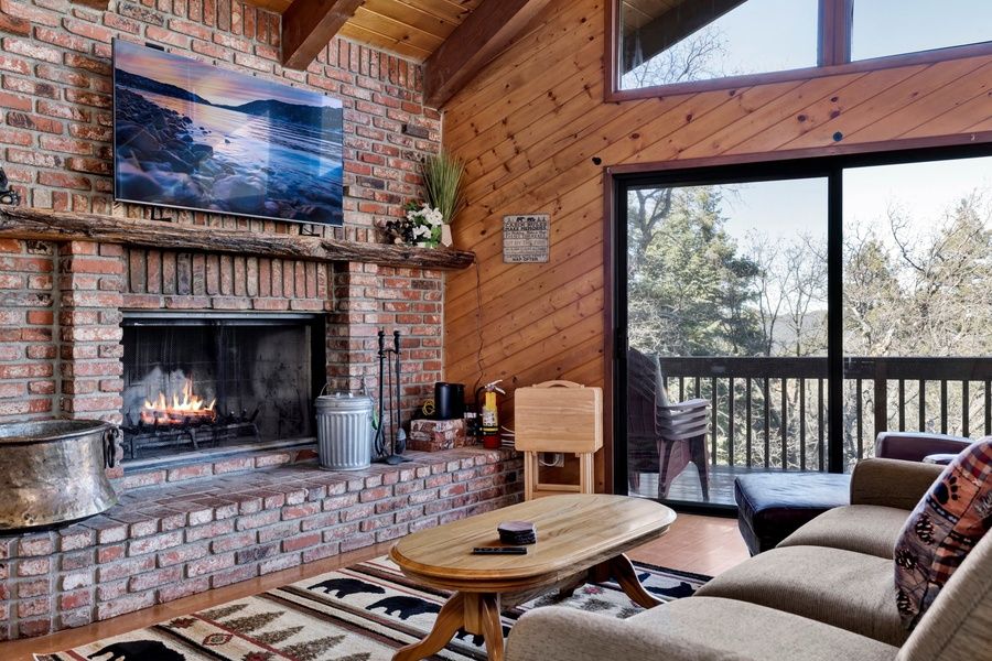 With three beautifully appointed bedrooms and two bathrooms, there's ample space for everyone to unwind and enjoy each other's company. The heart of the home features a spacious living area with cathedral ceilings and large windows, allowing natural light to flood the space and providing picturesque views of the surrounding forest. A floor-to-ceiling stone fireplace adds warmth and ambiance, perfect for cozy evenings. The open-concept kitchen is equipped with granite countertops and a breakfast bar, making meal preparation a delight.