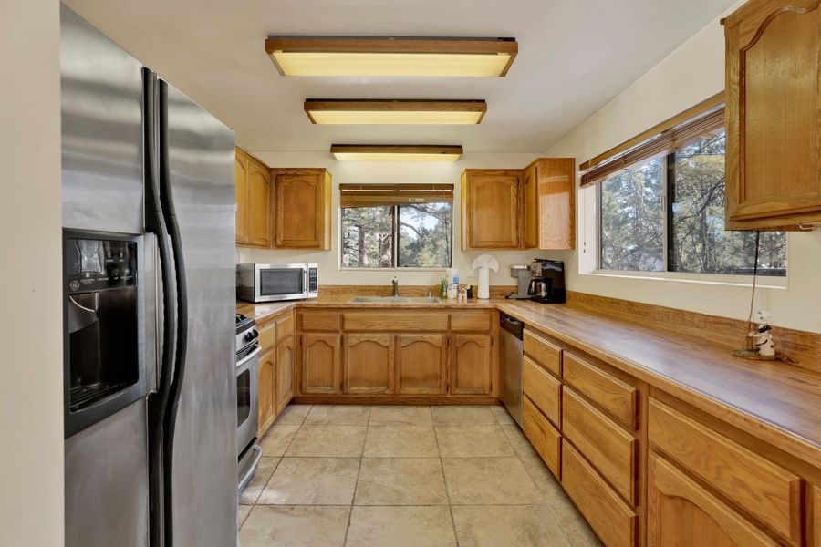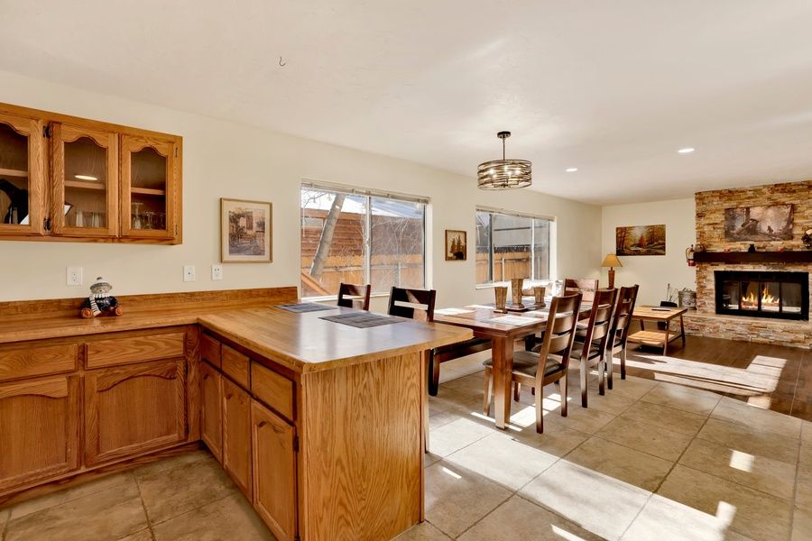 The heart of the home features an open concept living area with vaulted ceilings, creating a bright and airy atmosphere. A wood-burning stove adds warmth and ambiance, perfect for chilly mountain evenings. The fully equipped kitchen invites culinary creativity, while the adjacent dining area provides a welcoming space for shared meals and laughter. Step outside to discover a spacious deck that overlooks the surrounding forest, offering a peaceful setting for morning coffee or evening cocktails. Whether you're enjoying a game night indoors or stargazing under the clear mountain sky, Pine Woods Retreat provides a tranquil and comfortable base for your Sugarloaf adventures.
