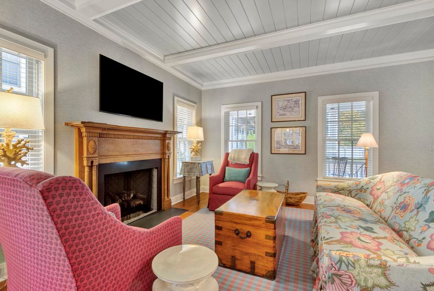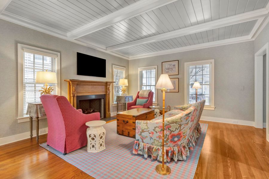 Inside, the home unfolds with a stunning blend of timeless details and modern upgrades. Beautiful pine floors run throughout, complemented by rich custom woodworking and elegant wallpapered rooms that add depth, personality, and a curated designer touch. Quartz countertops and carefully selected finishes elevate the kitchen and living spaces, while stylish decor and abundant natural light create an atmosphere that feels both sophisticated and welcoming.
