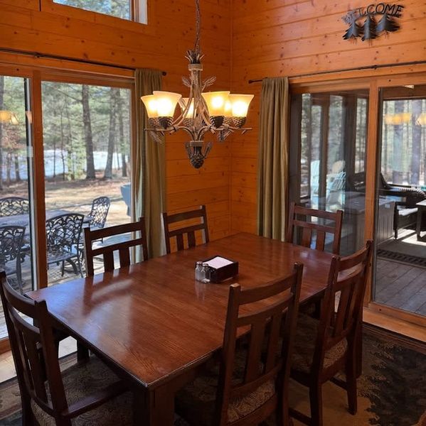 This beautiful off-water 5-bedroom log home is nestled in a quiet location, perfect for enjoying the Northwoods wildlife. While it’s off the water, there are over 3,200 lakes nearby in Oneida and Vilas County, offering plenty of opportunities for outdoor fun. Camp Pinemere is close to recreational activities, dining, shopping, a casino, and golf courses. It's a short walk to the neighboring Minocqua Park Complex, ideal for a pickup game of volleyball or a visit to the weekly farmer’s market. The property also offers access to snowmobile trails and is only 15 minutes from Minocqua Winter Park for winter adventures. Perfect for a family vacation year-round!