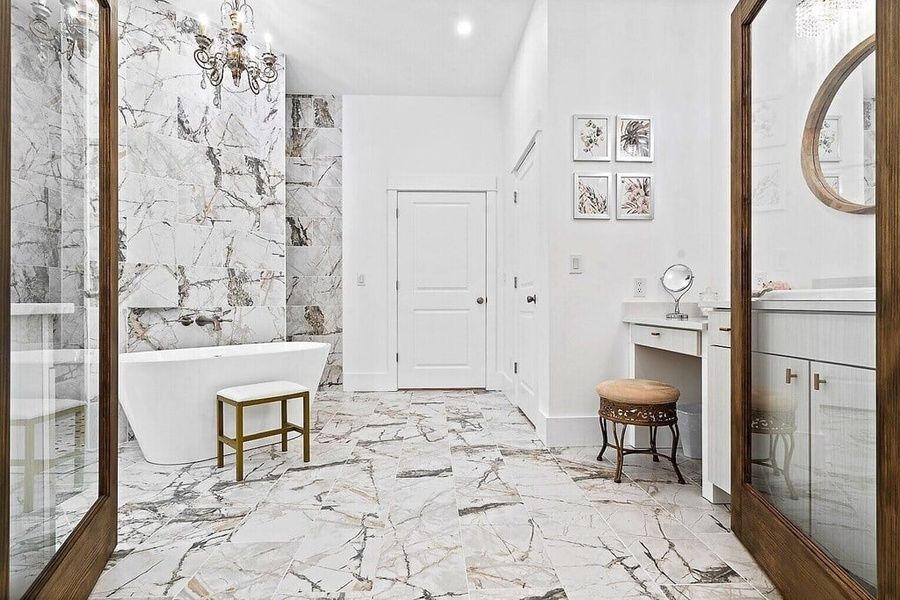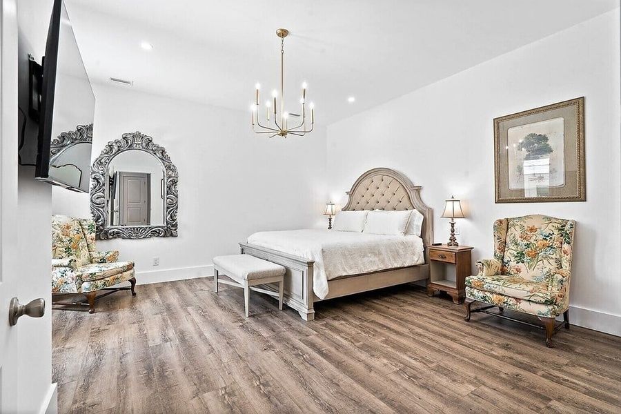Inside, the Master suite is large with a King bed, a comfortable chair and a gorgeous tiled zero entry shower, soaking tub and large walk-in closet. There's a secondary Master with King bed, walk-in closet, and lovely en-suite full bath with handmade vanity. The great room boasts 12' ceilings, antique brick walls, 3 sofas, TV, custom dishes cabinet, 10ft island and range hood. There's a refrigerator in the kitchen and another in the pantry along with a custom coffee bar.