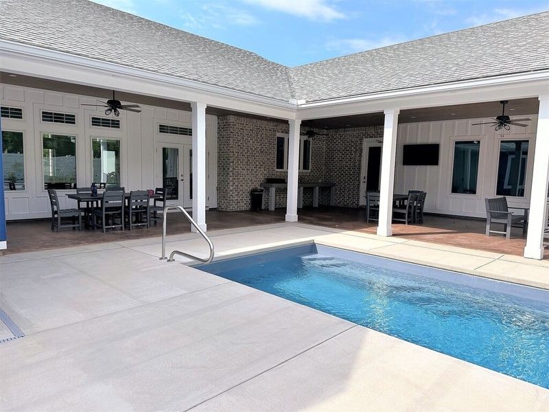 Enjoy the oversized covered patio area with 2 dining spaces, cooking counter with Blackstone Griddles, a TV, polywood benches and rockers. There's an outdoor fireplace with a wood or charcoal grill and firewood is even provided. Take a dip in the saltwater pool. It can be heated or chilled and loungers are provided for sunbathing or just relaxing. Then enjoy the hot tub or the hammocks while the kids play bean bag toss.