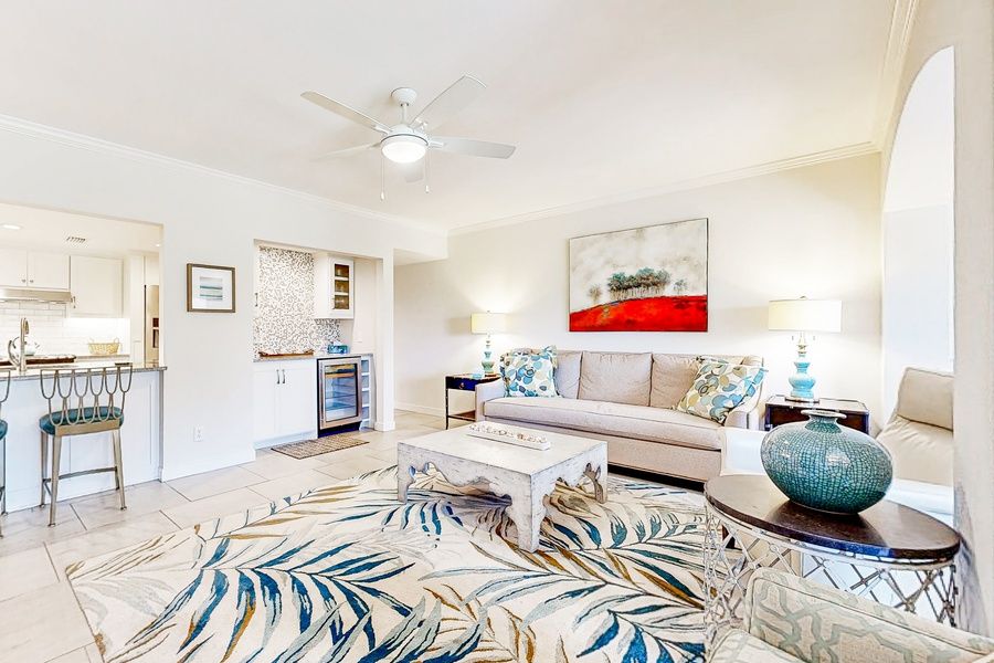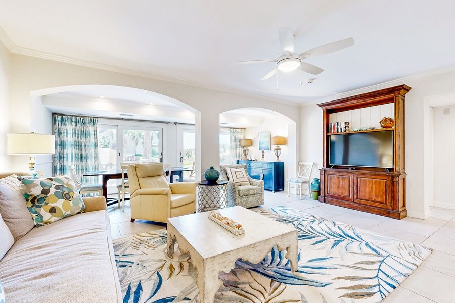 Experience the ultimate beach getaway at this stunning ground-floor condo located in the secluded and quiet oceanfront Windsong Villas! When you book this splendid escapade, you are granted access to the beautiful Windsong outdoor pool and a secluded beachfront, which is steps away. Discover scenic walking and biking trails on and off the Plantation. There are numerous shopping and dining options in this area as well, and the Nature Center offers plenty of entertaining amenities and family activities. Aury Island and Drummond Point Park offer a variety of activities and a greenspace to play. Historic Fernandina Beach is just a short 10-mile drive to the north end of the island and is the second oldest town in the country. It boasts many wonderful restaurants and shops, and the nightlife is entertaining and suitable for both young adults and families. Upon entering, discover a spacious open floor plan that makes this home away from home perfect for families with children. Spread out comfortably in the welcoming living room with a built-in bar and wine fridge and a smart TV with streaming and cable services to keep you all entertained during your stay. When mealtime comes around, surprise your loved ones with exquisite homemade meals prepared in the condo's completely renovated kitchen with new cabinets, granite countertops, and stainless steel appliances. The living area and main bedroom open to a grassy lawn with impressive views of the Atlantic Ocean and a private patio with outdoor dining. Additional perks include TVs in all bedrooms, a washer/dryer. Things to Know Golf cart available for a nightly fee, must be rented for entire stay.