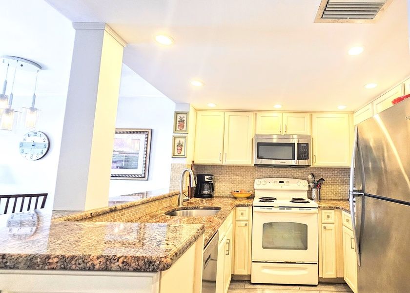 The fully equipped kitchen is prepped for you to create anything from sunrise breakfasts on the balcony to moonlit dinners within the condo. "Kids high chair included"