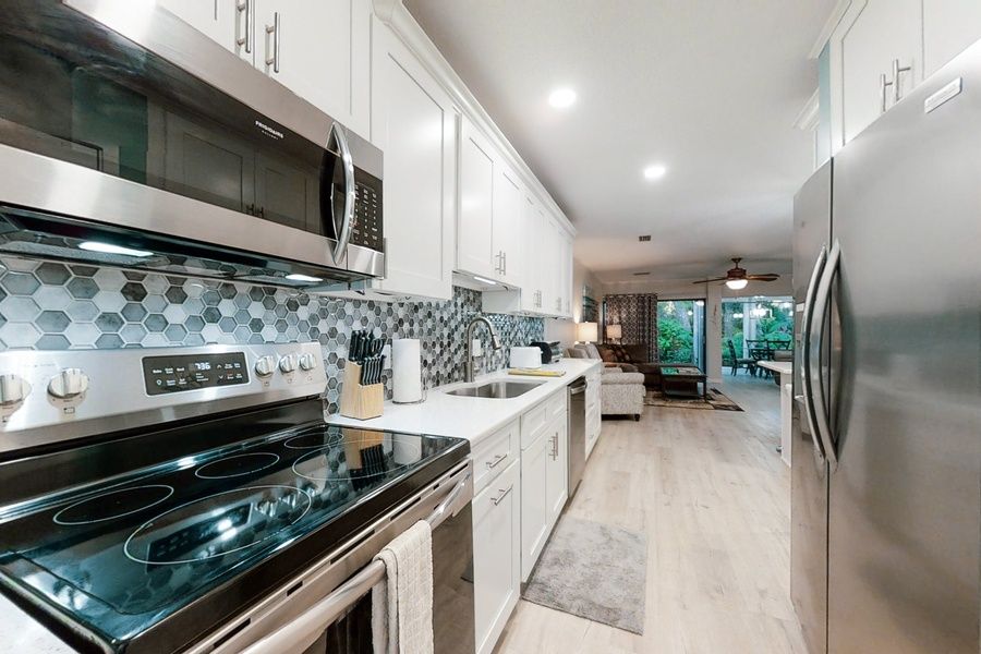 Welcome to your secluded escapade! Spacious main living areas feature tile flooring, a wet bar, and an enclosed sunroom. The bright kitchen has a custom backsplash and opens to the quaintly decorated courtyard. The primary suite has a private bath and spacious closets. The guest bedroom also has a sliding glass door and has access to the customized guest bath. Located just steps from the beach, shopping and dining, it is perfect for a vacation on Amelia Island. Things to Know Dog-friendly No access to the pool from Lagoon Villas.