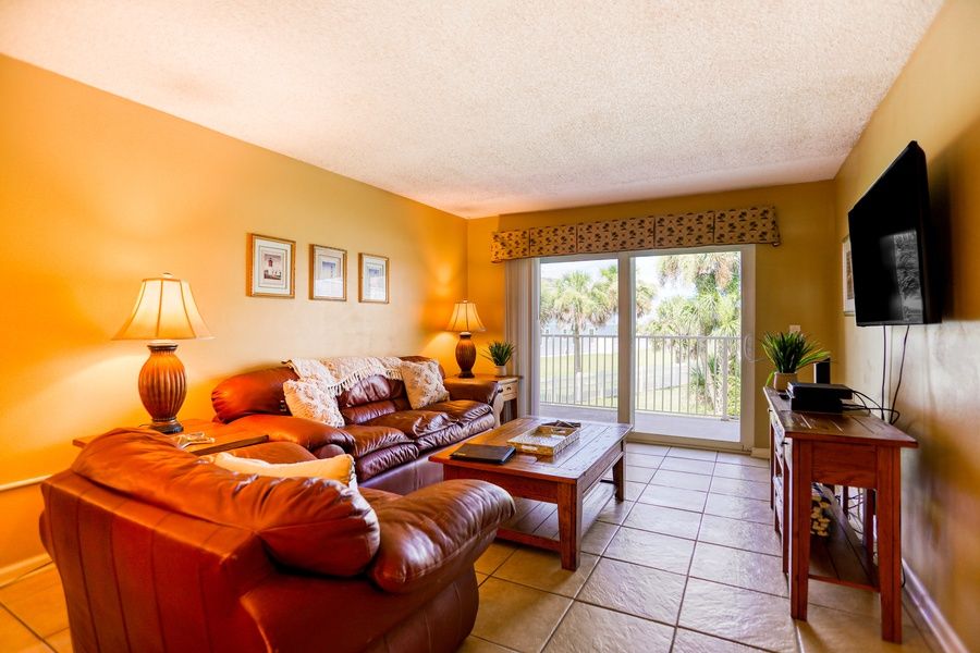 Wake up to the sounds of ocean waves and rustling palms at this two-bedroom condo in the St. Augustine Beach & Tennis Condominiums, where the beach is practically outside your door, Fiesta Falls Miniature Golf is two miles away, and the historic heart of St. Augustine is only a few miles north. This oceanfront resort enjoys a world-class setting, with a wide stretch of beach just across the dune walkover. There are also two oceanfront pools, 10 lighted tennis courts, a fitness center, and a grilling area on the grounds for your enjoyment. If you're hoping to explore the oldest city in America, the St. Augustine Historic District is just over six miles north. As you enter this second-floor condo, you'll be greeted by central AC, high-speed WiFi, and a view of the ocean from the balcony beyond the sliding glass doors. The main living areas are open to each other, including a well-equipped kitchen, a dining space, and a living room with leather seating and a smart TV. Additional amenities include a primary bedroom with its own smart TV and direct access to the balcony. THINGS TO KNOW.