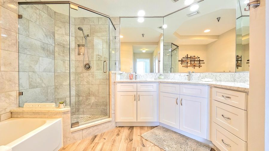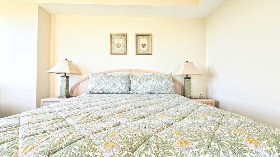 The Master bedroom features a comfy King bed, a large window displaying an amazing perspective of the Ocean and a sliding glass door leading to the balcony. The Master en suite features an elegant glass enclosed shower, soaking tub, double vanities and private watering closet. (toiletries are also provided)