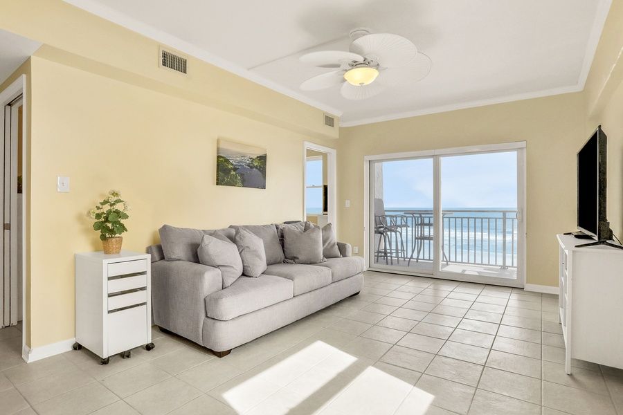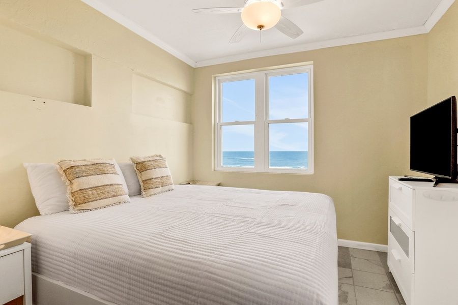 Greet each morning with a spectacular sunrise over the Atlantic at this oceanfront condo in Jacksonville Beach. Beautifully remodeled throughout, this light-filled condo is a place to spend your days swimming, sunbathing, and making family memories to last a lifetime. This condo sits on the fourth floor of an oceanfront building, one with a lovely outdoor swimming pool and a walkway crossing the dunes to the beach. Here in the heart of Jacksonville Beach, you'll be within walking distance of restaurants, cafes, shops, and the Jacksonville Beach Fishing Pier, and a quick drive from Neptune Beach, St. Johns Town Center, and other local attractions. After a day of watersports, take the elevator back up to the fourth floor to relax, unwind with a cold drink, and soak up the beautiful scene outside on the beachfront balcony. Thanks to its corner position, the condo is full of sunlight and views of the Atlantic. The thoughtfully renovated living space includes a washer/dryer by the door to take care of the day's swimsuits, an open kitchen with a breakfast bar, and an oceanfront living room with a TV. Of the two connected bedrooms, one is a primary bedroom overlooking the beach with its own TV. Things to Know Jacksonville Beach is currently performing street construction in the area.