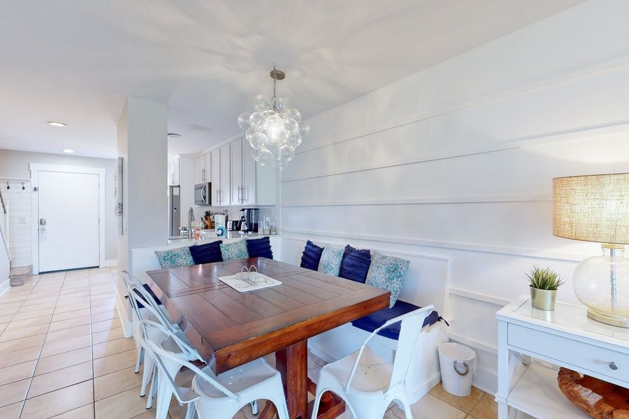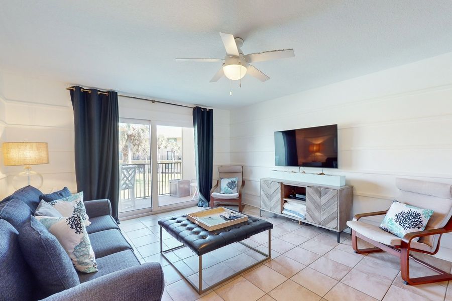This ocean view 2BR/2.5BA condo boasts abundant on-site guest amenities. Enjoy tennis, pickleball, racquetball, basketball, playgrounds, a new fitness center, and four heated pools! You'll also have direct access to secluded Crescent Beach. Fresh from a top-to-bottom remodel, your stylish rental features charming beach decor, inviting ocean tones, and cool tiled floors. Unwind on the private balcony and dine alfresco while enjoying the fantastic weather. LIVING AREA Relax in the open living area, furnished with two rocking chairs and a plush sleeper sofa. Watch a movie on the 55” 4K TV with Apple TV and a DVD player, or break out the provided board games for good old-fashioned family fun. KITCHEN and DINING Prepare home-cooked meals and beach snacks in the well-appointed kitchen, equipped with sparkling quartz countertops and stainless steel appliances. The dining table provides ample seating with four chairs and a banquette. BED and BATH Perched on the second floor, this two-story unit sleeps eight guests between two bedrooms and a sleeper sofa in the living area. Upstairs, the master suite features a king bed, a 40” TV, and a large window with partial ocean views. The en-suite bathroom is configured with a walk-in shower. Also on the second floor, the guest bedroom has a queen bed, a twin-over-twin bunk bed, and a 32” TV. Across the hall, a full bathroom offers a tub/shower combination. Providing added convenience, a half bath is located downstairs. OUTDOOR AREA A balcony off the living area overlooks one of four pools and offers partial ocean views. Dine alfresco at the bistro table for four. EXTRA AMENITIES and MORE DETAILS As part of the community at Summerhouse Beach and Racquet Club, you'll have access to a plethora of amenities during your stay. Enjoy six tennis courts, four heated pools, four racquetball courts, two basketball courts, two children's play areas, and a brand-new fitness center. You'll also have private access to the beach! Additional perks include complimentary Wi-Fi, cable TV, Netflix, an in-unit washer/dryer, and parking for two cars (one designated spot and one unassigned space). Please note that this unit is on the second floor and is only accessible via stairs. THE LOCATION Take the community walkover to Crescent Beach and enjoy a sun-kissed day by the ocean. This secluded beach offers a less crowded stretch of hard-packed sand -- perfect for beach bike rides, walks, frisbee, and volleyball. Brush up on local history with a visit to Fort Matanzas, just a half-mile away. Or drive under 4 miles to reach Marineland for interactive opportunities with trained dolphins.