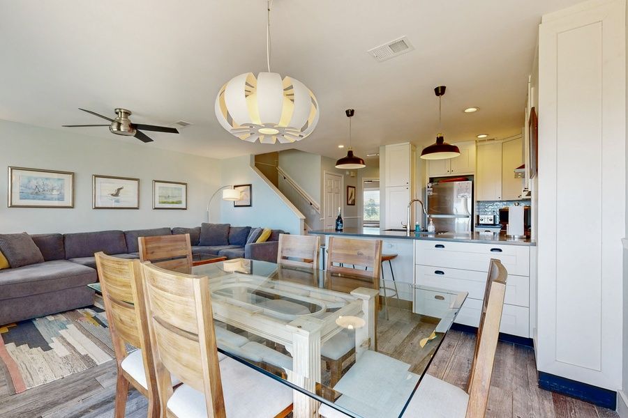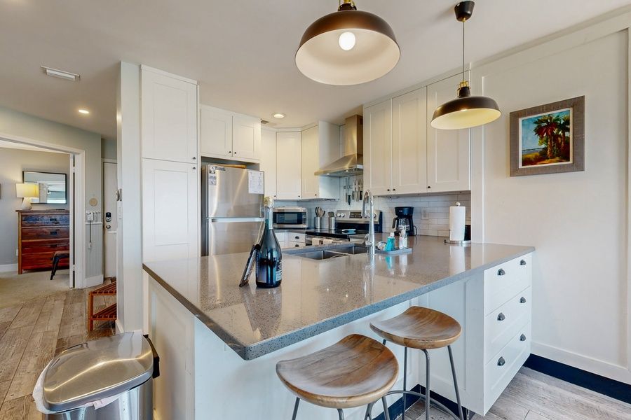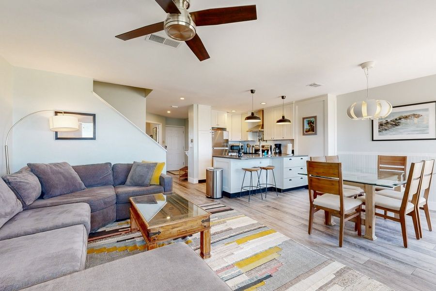 This unit has a fully equipped kitchen with combined living and dining areas, a brand new washer and dryer, and a cable TV. The ocean-view primary bedroom is located upstairs and has a king-size bed, just for lazy morning sunrises from your bed, with a walk-in shower. The upstairs guest bedroom has a twin-over-queen bunk bed with your own private bath that has a tub/shower combo. The third bedroom is located on the main level with the living area and has a queen bed and a shared bath with a tub/shower combo. All mattresses are brand new, so you're sure to get a great night's sleep! This unit is an oceanfront townhouse with an entrance on the second level. THINGS TO KNOW The condo does have about 16 stairs to the front entry and about 18 stairs located inside the unit.