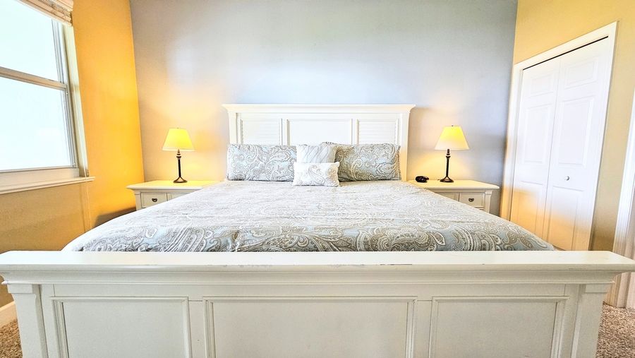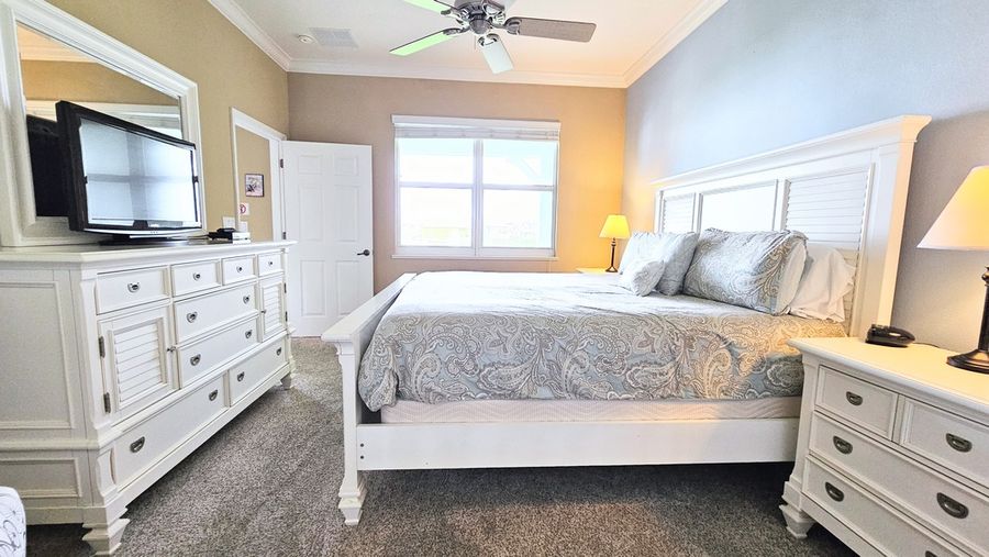 Inside, this beautifully appointed three-bedroom condo is designed for comfort. The master suite is a private retreat, featuring a plush king bed and an en-suite bathroom with a luxurious soaking tub, a glass-enclosed shower, and a double vanity. The two guest rooms are equally inviting—one with a cozy queen bed and another with two sets of bunk beds, perfect for the kids or extra guests. A full guest bathroom ensures everyone has their own space to refresh and rejuvenate.