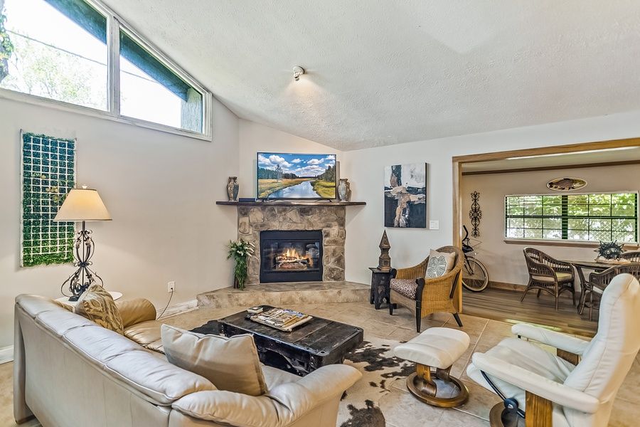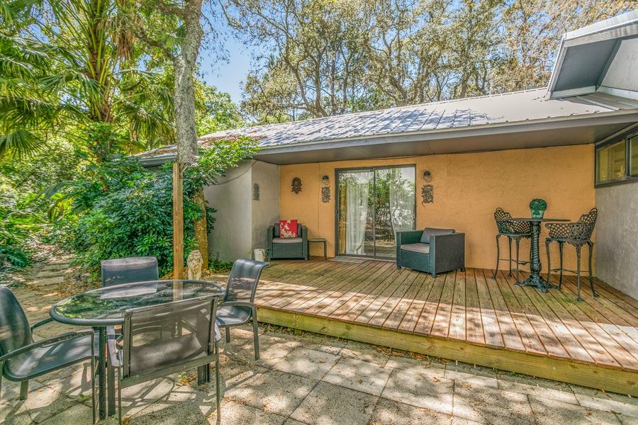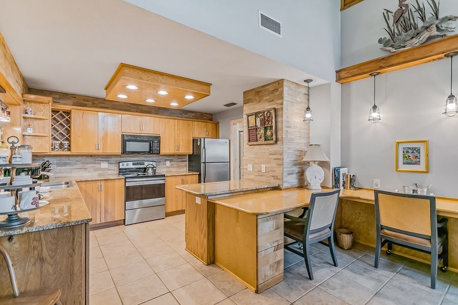 Come relax at this home built for fun times! Upon first entering this home, guests will first see come across the game room corner featuring table shuffleboard and the home's private pool table. It sets the tone perfectly for this eclectic home full of space to enjoy each other's company. Cool down inside in the central air conditioning or get some fresh air out on the furnished patio. A two-person, built-in desk can provide a workspace for guests that need to complete remote work or schooling. At mealtimes, guests can enjoy cooking together in the full kitchen, equipped with full-size appliances, a dishwasher to help with cleanup, and a breakfast bar that seats two guests for a casual meal. The bedrooms of this home are all down one hallway, just to the right as guests come through the front door. Just past the laundry room on the left, the first bedroom features a backyard view and vanity. The full bathroom across the hall (featuring a shower/tub combination) can serve guests at this room. The second bedroom is down the hall to the left, and this sunny room features extra seating and a private entrance to the patio. The full bathroom across the hall from this bedroom features lovely tilework and a stone standalone shower. At the end of the hallway, the third bedroom is just to the right and features a closet with a barn-style door. The main bedroom is at the end of the hall, and features extra seating, a private entrance to the patio, and an en suite bathroom with double sinks, a standalone shower, and a soaking tub. Every bedroom features a mounted flatscreen TV. Things to Know Free high-speed WiFi and cable Full kitchen with a dishwasher Dog-friendly Beach towels are available for guest use Please note that the fireplace is decorative only Netflix and HBO streaming is available with guest accounts Age-appropriate dinnerware are available for younger guests Two adult bikes are available for guest use.