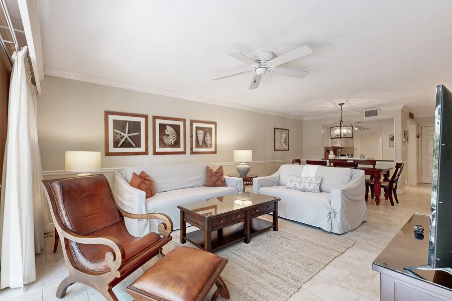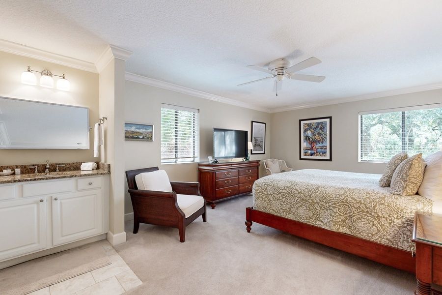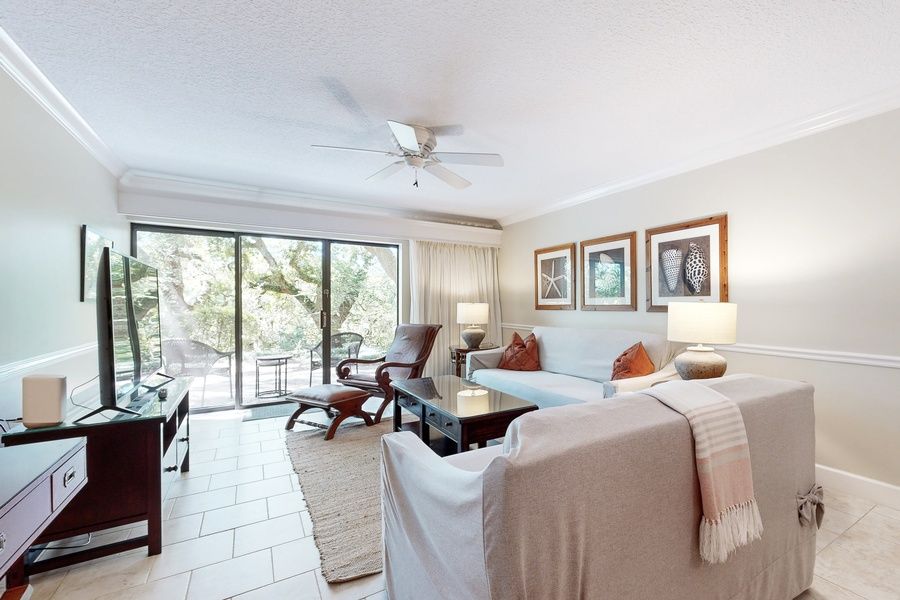 Beautifully situated on the ground floor at the end of its row, this newly renovated, two-bedroom, two-bathroom condo enjoys a fantastic setting in the Omni Amelia Island Plantation. Enjoy wonderful privacy and a spacious patio that's perfect for morning coffee and dining with a view of the golf course and lake. Inside, the open floor plan is excellent for entertaining friends and family. The well-equipped kitchen has granite countertops, lovely sea glass backsplash, and an adjacent linen room with full-size washer/dryer. The living room offers a desk for easy work setup and a 55-inch smart TV for viewing your own favorite streaming services. High speed internet and WiFi are also available. The large primary bedroom has a king bed, a 50-inch flatscreen TV, and a newly renovated en suite bathroom with a walk-in shower (with a hand-held showerhead). The second bedroom has two twin beds, a 50-inch flatscreen of its own, and a newly remodeled bathroom with a hand-held shower and a tub. This condo is a short walk from the beach access point, shops, the spa, restaurants, and mini-golf at the Omni Amelia Island Resort Village. Or, you can go explore the many amenities and activities that Amelia Island has to offer, including swimming, hiking, golf, tennis, biking, fishing, and dining. Things to Know