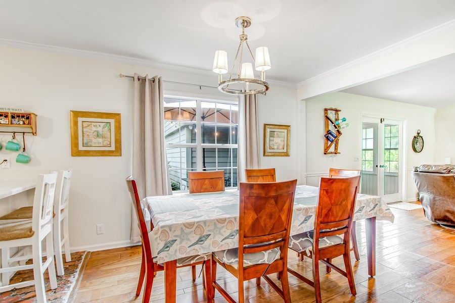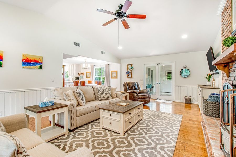 This delightful, two-story, four-bedroom home offers ideal indoor and outdoor spaces for the perfect family vacation on St. Simons Island! The ground-floor great room boasts a well-equipped, full kitchen with a breakfast bar, an adjacent dining area with a table for six for meals or family game nights, and an open living area with high ceilings, stylish furnishings, and a wall-mounted flatscreen TV. Make your way outside to watch the world go by from your furnished front porch or head out back to the yard complete with a gas grill and table and chairs for summertime cookouts and a bocce ball court. For sleeping options, this home offers four cozy bedrooms including a lower-level suite as well as a kid-friendly bunk room and a main bedroom with a bed and en suite bath on the second floor. THINGS TO KNOW High chair, baby gates, booster seat, and more provided. The bocce ball set is located in the enclosed breezeway.
