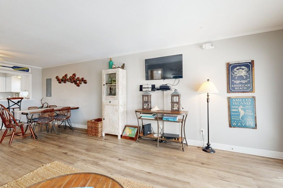 The idyllic island life awaits at this stylish escape, located across the street from Fernandina Beach. Highlights of your unit include a private deck with partial views of the Atlantic Ocean, three smart TVs, and a well-appointed full kitchen. Stroll mere steps to the beach for blissful days playing in the dazzling sand and surf. Head 1 mile north to discover a selection of beach shops and restaurants along Fletcher Avenue. Or drive 5 miles into charming and historic downtown Fernandina Beach to go antiquing, sample an array of local eateries, or find nighttime entertainment at the historic Palace Saloon. Tee off at Fernandina Beach Golf Club (1 mile) or Amelia River Golf Club (2.5 miles).