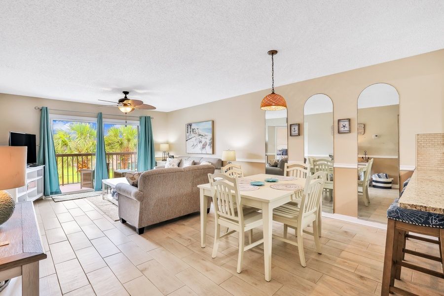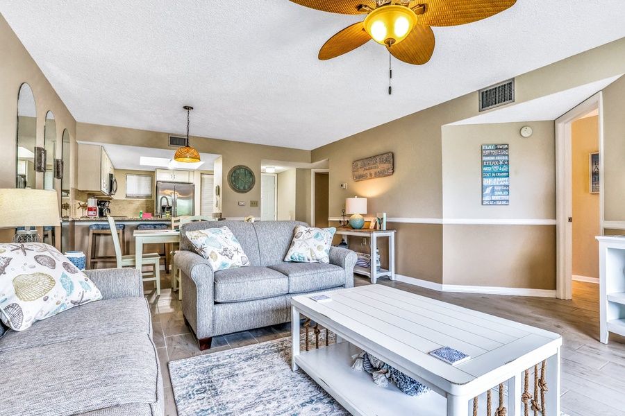 Light and breezy, this spacious condo is ready to welcome beach fans! The decor is beach-inspired from stem to stern, and the neutral colors with bright touches add a touch of sophistication. Enjoy the fresh air out on your own private furnished balcony, or relax in the central air conditioning inside. Enjoy meals together at the breakfast bar or at the formal dining area. The full-size appliances (plus a dishwasher!) will help you cook up anything you re craving on vacation. Guests of this condo can also enjoy access to a shared pool, tennis court, and shuffleboard court during their stay.