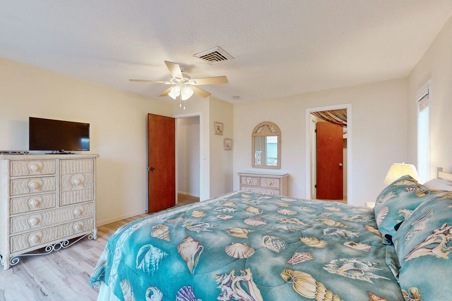 Situated on a quiet cul-de-sac in lovely Vilano Beach, the spacious 3BR/2.5BA Seaside Cottage is brimming with coastal charm. Enjoy abundant indoor and outdoor living space -- including a sunroom, two patios, and a large palm-lined backyard. With a superb location just four properties away from the shoreline, you'll arrive at Vilano Beach in approximately 1 minute! You're also within walking distance to the shops and dining options in Vilano town center. LIVING AREA The living room is designed for relaxation, complete with two comfy sofas and a 55” cable TV with a DVD player. Spend quality time in the spacious sunroom, featuring vaulted wood-beam ceilings and multiple seating areas. KITCHEN and DINING Whip up favorite recipes in the fully equipped kitchen, outfitted with a full suite of appliances -- including a dishwasher. Keep the chef company at the two-seat breakfast bar. Kitchen extras include a coffee maker, tea kettle, toaster, and blender. When it's time to eat, choose between an array of dining areas. There's a four-seat table in the dining room, sunroom, and on the patio. BED and BATH This two-level home sleeps up to six guests in three upstairs bedrooms. Wake up to the serene sound of ocean waves in the master suite, outfitted with a king bed, a 40” cable TV with a DVD player. A balcony offers partial ocean views. The en-suite bathroom features a walk-in shower as well as a walk-in closet. The second bedroom includes a queen bed, 40” cable TV, and direct balcony access. The third bedroom is furnished with two twin beds and a 40” cable TV. The adjacent guest bathroom is configured with a tub/shower combination. A convenient half bathroom is located on the main level. OUTDOOR AREA and AMENITIES Unwind on the backyard patio, bordered by palm trees and well-maintained landscaping. Fire up the grill and dine alfresco at the four-seat patio table. A covered front porch offers more seating, and is a great spot for morning coffee. EXTRA PERKS and MORE DETAILS Complimentary Wi-Fi and a washer/dryer are provided. Parking is available for three vehicles (one in the garage and two in the driveway). THE LOCATION Walk just 1 minute to Vilano Beach! White sand blended with ground coquina shells gives the beach a gorgeous peach tint. This beach is ideal for surfing, snorkeling, and building sandcastles. Rent kayaks and explore the famed Intracoastal Waterway, or stroll or bike along the surrounding pathways. You'll also be within easy walking distance from an array of beachside shops and dining options in Vilano town center. Cruise 5 minutes to explore historic St. Augustine, the country's oldest city!