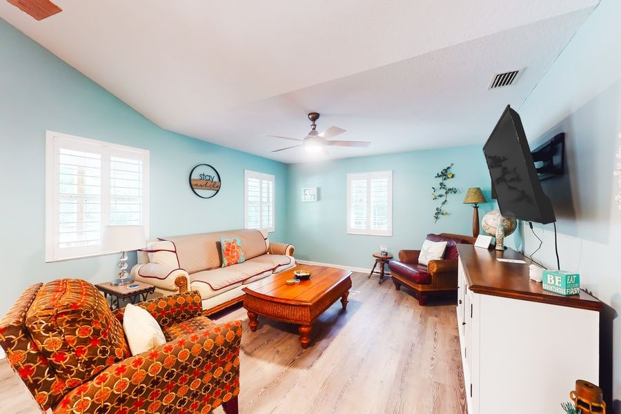 Located in a friendly St. Augustine neighborhood, you'll find this Sunset Circle charmer! Surrounded by mature, tropical landscaping, this lovely home offers comfortable living quarters amidst the palms. The cheerful interior has it all, a spacious living room, a gleaming full kitchen, and a delightful dining space. When you aren't tuned into your favorite TV show on the living room's smart TV, enjoy some quiet time amongst the bedroom's high-quality linens, private TVs, and tasteful decorations. With perks like a private washer/dryer, central air-conditioning, and board games - your every need is met. There is plenty of room for a boat as well. Outside, enjoy the pleasant sea breeze from the enclosed yard, equipped with a grill and firepit. Grab a tube and lazily float down the serene private creek or sit and appreciate the wildlife, such as otters and owls, in the evening. Away from your stay, indulge in some thrill when booking a flight with First City Helicopters, don your hiking shoes to walk around Fort Mose Historic State Park, and explore Downtown St. Augustine's delicious eateries and vibrant boutiques. For easy travel, be sure to utilize the nearby trolley, located at 167 San Marco Ave. Things to Know Check-in time: 4:00 PM Check-out time: 10:00 AM All guests shall abide by the good neighbor policy and shall not engage in illegal activity. Quiet hours are from 10:00 PM to 8:00 AM No smoking is permitted anywhere on the premises.