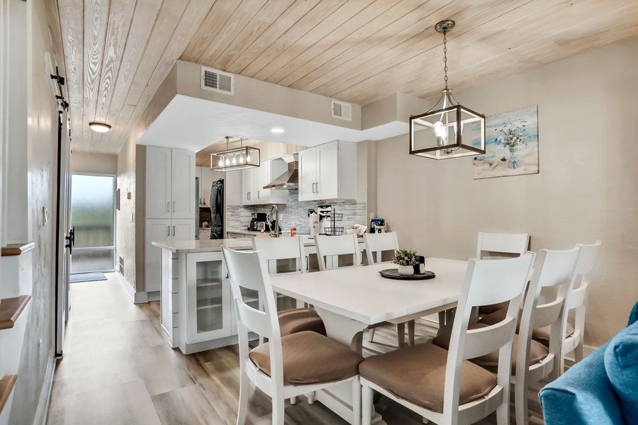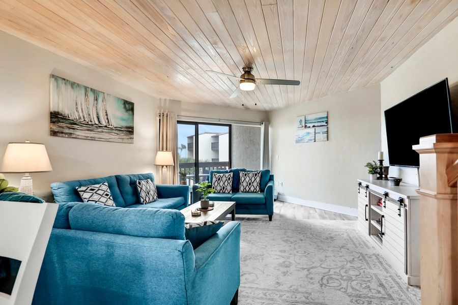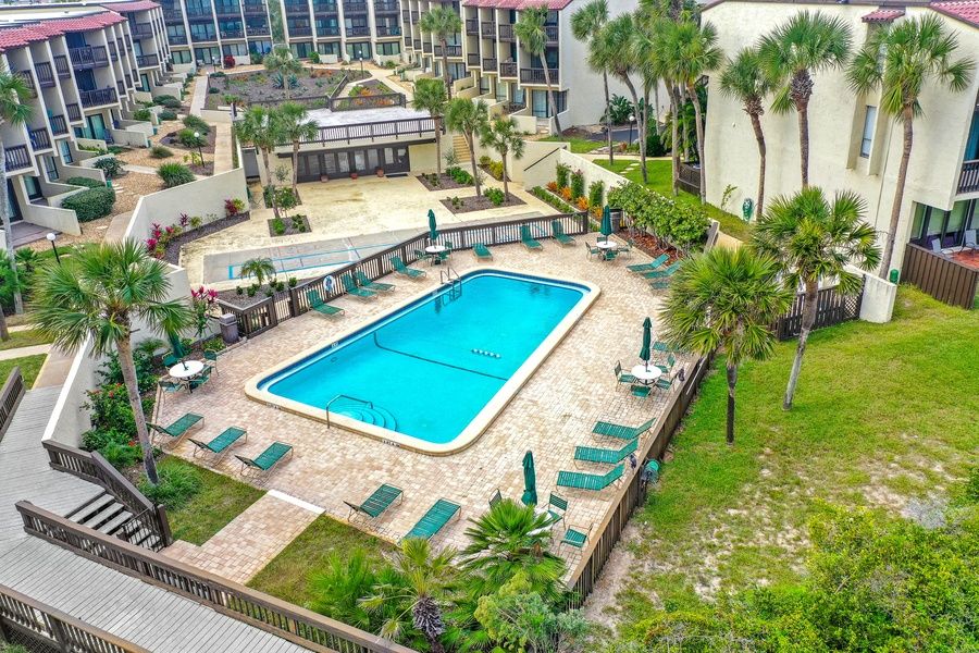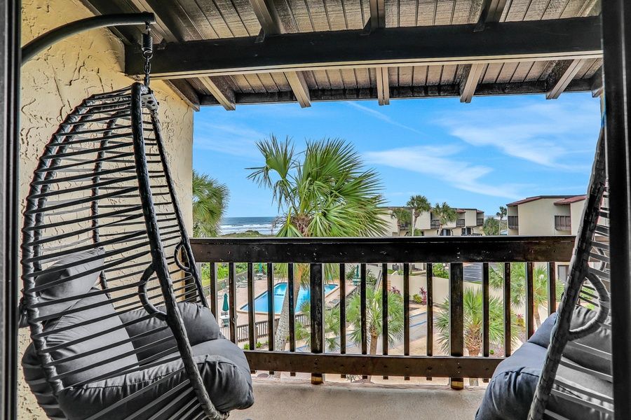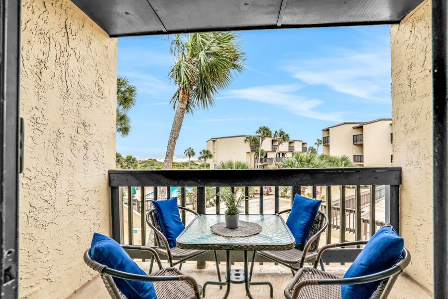 The white sand and crashing ocean waves of Butler Beach are practically at your doorstep when you escape to this two-bedroom condo in St. Augustine. Here at the beachfront Island House Condominiums, you'll have a view beautiful sunrise ocean views from three balconies and access to a pool and sundeck on the grounds. The Island House Condominiums are located right on the ocean in Butler Beach, a lovely section of St. Augustine about eight miles south of the historic district. After a day of lounging on the beach, stroll home across the property's private boardwalk with the provided chairs, towels, and other beach gear in hand. Back at the condo, you can relax and unwind in your home away from home. The living space is spread out across two levels, with chic, contemporary decor found throughout. Beginning in the fully stocked kitchen, there are stainless steel appliances, generous cabinet storage, and a stacked washer/dryer for your convenience. The rest of the main floor includes an accommodating dining space and a living room with a smart TV. You'll have all the amenities needed for a complete and wonderful stay, including central air-conditioning and complimentary WiFi should you need to plug in. COMPLEX AMENITIES -Outdoor swimming pool -Private boardwalk to the beach THINGS TO KNOW Guests must use the stairs to access this second-floor suite. Streaming TV services require guest accounts to access.