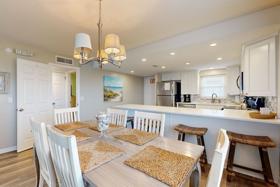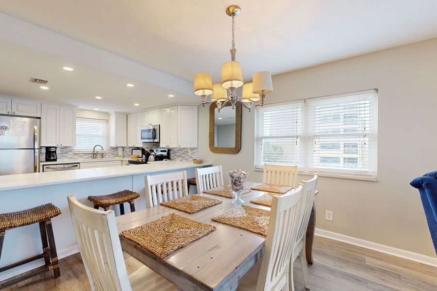 Enjoy expansive ocean views and vibrant sunrises from the furnished balcony. Featuring abundant natural light, your corner condo is beautifully designed with coastal furniture and decor. Relax in the light, airy living area, equipped with a plush sofa and three chairs. Kick back and relax with your favorite shows on the 50-inch smart TV in the living room. The chef in your group will appreciate the modern kitchen, equipped with a full suite of stainless steel appliances. When your culinary creations are complete, dine together at the wooden table. Or sip morning coffee at the kitchen bar. Extra perks include complimentary WiFi and a washer/dryer.