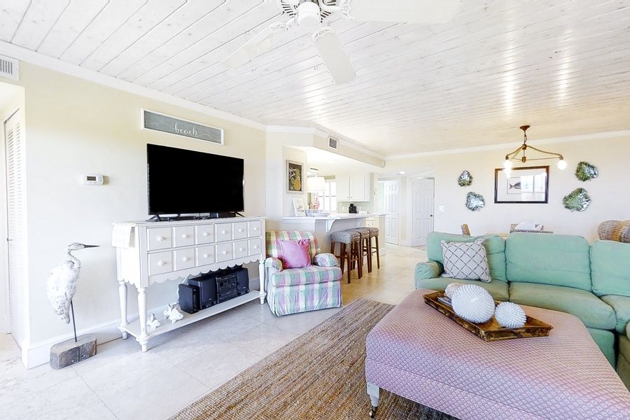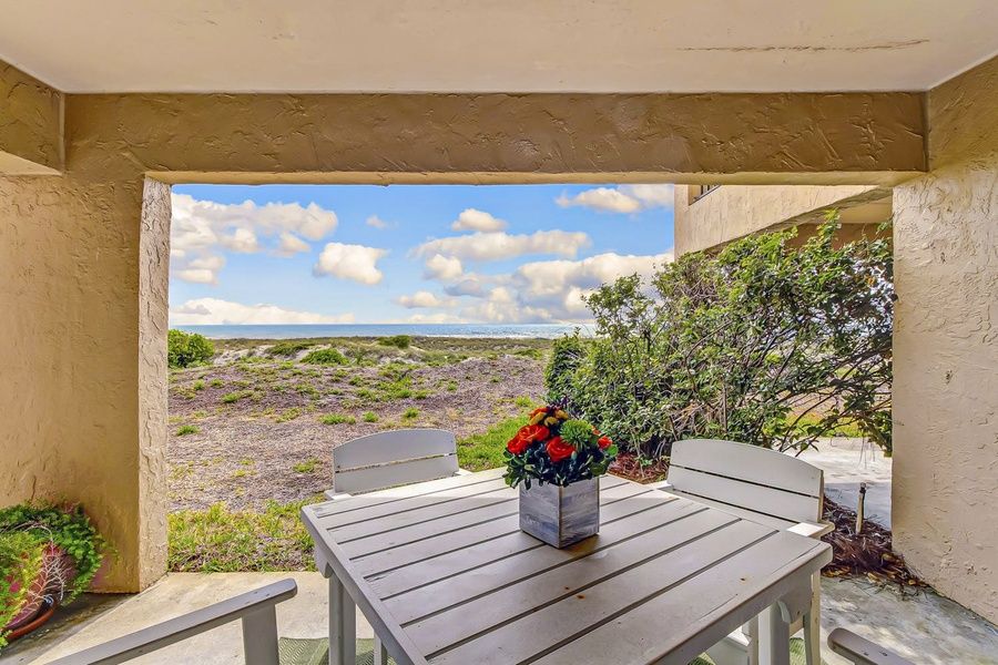 Lovely and well-maintained, this fabulous condo has a large patio off the living room, and another off of the primary bedroom. The patios nearly sit atop the beautiful sand dunes. Our guests will experience a sense of privacy while relaxing on the Adirondack chairs, watching the sunrise as you enjoy your cup of coffee, or savoring an outdoor meal with the ocean breeze. The patio is also located near a green space which is perfect for tossing a football or watching your children or grandchildren enjoying the island sun. This beautiful condo has recent renovations including marble floors, gorgeous wood plank ceilings, modern bathrooms, crown molding and woodwork, a vanity in the primary bedroom, and personal and creative designer touches throughout. The kitchen has been updated with all new flatware, dishes, pots, pans, a Keurig coffeemaker, and more. The living space was designed with comfort and relaxation in mind. Kick back on possibly the world's most comfortable couch. Get a great night's sleep on the king, queen, or twin-size beds. The plantation shutters provide privacy at night, but open to provide spectacular ocean views during the day. The living room has a large comfortable couch and two comfortable padded rockers. Enjoy watching a game on the large flatscreen television (with cable access), or watch a movie on the DVD player. The dining room table has room for four with additional seating for three more at the bar. Guests will enjoy the attention to detail and fun décor throughout the condo. The ground floor gives guests ease and convenience for moving from the parking lot to the condo and patios and onto the beautiful beach. There is a small ramp for access from the parking lot to the sidewalk and the condo entry doorway is 35 inches at its most narrow point. This could be accessible for wheelchairs of this width or smaller. The condo has a primary suite with an oceanfront patio and view, a king-size bed with an en-suite bathroom with a bathtub and shower (it also has an additional vanity and basin, a wall-mounted flatscreen television and cable access, and a large walk-in closet. The second bedroom has a queen-size bed and a twin bed. The attached renovated bathroom has a large walk-in shower. This bedroom also has a flatscreen television and cable access. Things to Know