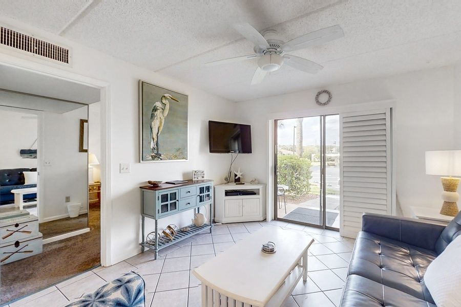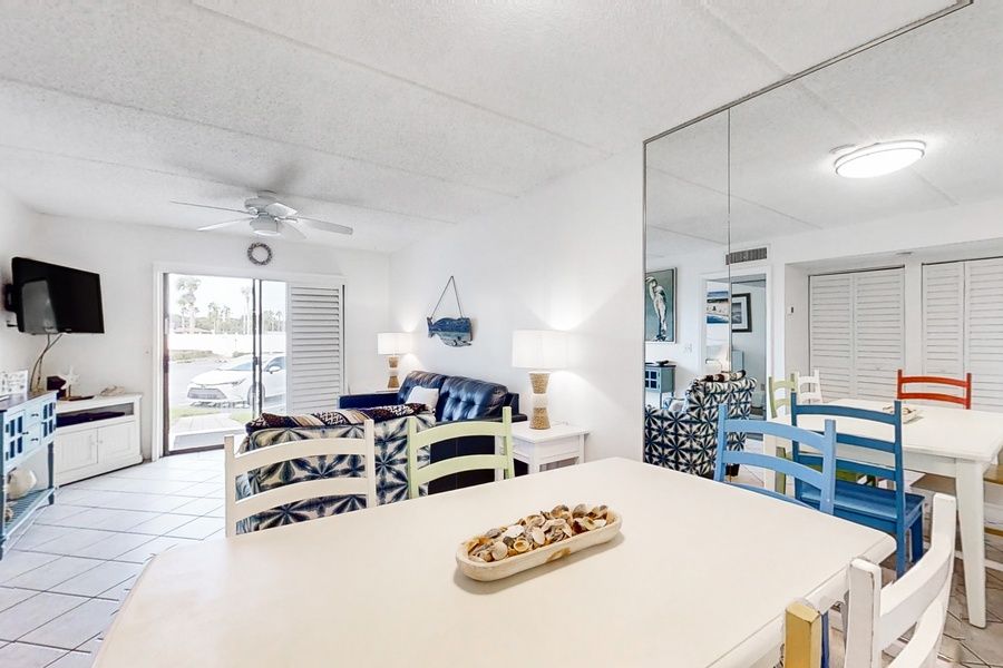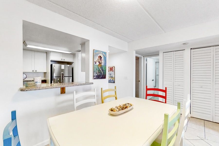 Ocean & Racquet Getaway — Award-Winning Beachfront Bliss in St. Augustine Welcome to your slice of paradise at Ocean & Racquet Club, voted St. Augustine's Best Condo Community and perfectly perched on the powdery white sands of Anastasia Island. With private beach access just steps from your door, and National Geographic naming St. Augustine a top global destination, this is more than a vacation — it's a win-win coastal escape. Wake up early to watch the sunrise with your toes in the sand, then spend the day basking by one of two resort-style pools (one heated for cooler days). In the evening, sip wine on your private patio as the sky fades into sunset — pure beachside serenity. ️ The Condo This colorful, retro beach-themed condo is bright, inviting, and thoughtfully stocked for comfort and fun. • Primary Bedroom: King-size bed + private ensuite bathroom • Guest Bedroom: Two twin beds + full bathroom • Living Room: Sleeper sofa for extra guests • Kitchen: Fully equipped – just stop by Publix and you're set • Extras Included: Beach cart, chairs, boogie board, skimboard — everything you need for a carefree beach day! Conveniently located on the first floor of Building 2, you'll be just steps from the heated pool and a bubbling hot tub tucked inside the courtyard — ideal for a relaxing soak after your adventures. ️ Resort-Style Amenities • Two sparkling pools (one heated) • 24-hour gated security • Private beach access • Hot tubs & sun decks • Tennis courts & racquetball court • Freshwater fishing ponds • Clubhouse for events or gatherings • Easy trolley access to Historic Downtown What's Nearby You're just minutes from the historic charm of downtown St. Augustine, the Nation's Oldest City, where cobblestone streets, horse-drawn carriages, and centuries-old landmarks await. Walkable fun & local flavors: • St. Augustine Pier & Splash Park • Weekly Wednesday Farmer's Market at the Pier • Casual & upscale restaurants • Ice cream shops, beach boutiques, and more Short drive to: • World Golf Village – Two championship courses + the World Golf Hall of Fame • Dolphin cruises, deep-sea fishing, parasailing, and boat rentals • Mini golf, museums, ghost tours, trolley rides, and artisan shops • Scenic parks, historic forts, and unforgettable sunsets Whether you're here for romance, relaxation, or family fun, Ocean & Racquet 2 is your passport to the best of St. Augustine. From morning sunrises to vibrant nights on the town — this is where memories are made. Things to Know • A USD25 one-time parking fee is required per vehicle • Linens and starter essentials provided • No pets permitted per community rules • On-site laundry available Book today and enjoy your stay!!