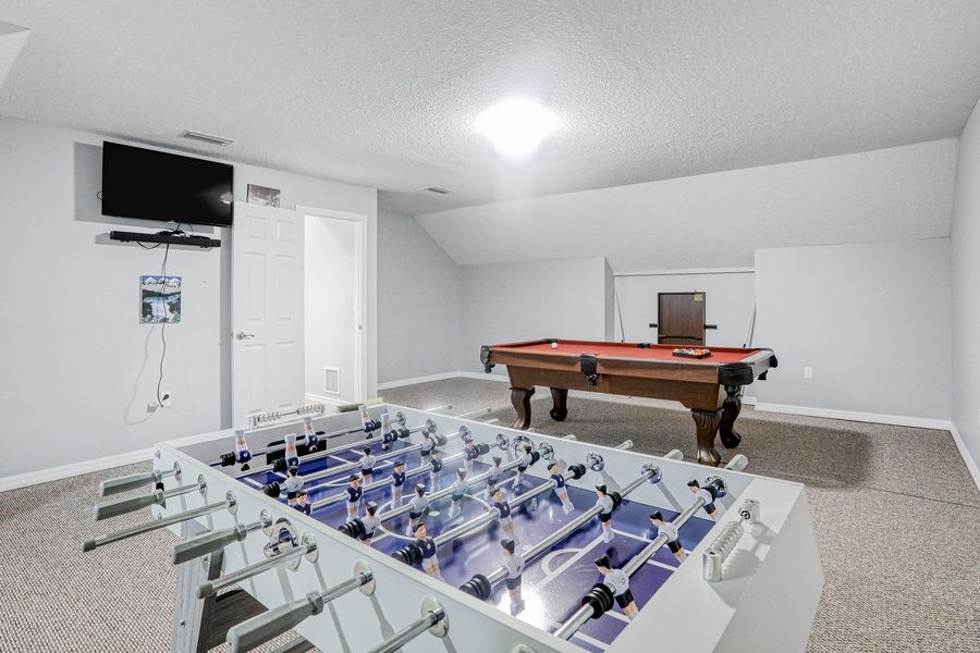 With the gorgeous sands of Vilano Beach two miles to the east and the charming Historic District of St. Augustine less than a mile south, you're spoiled for choice when it comes to activities at this lovely family- and dog-friendly home, tucked into a large yard and surrounded by trees. Brew some coffee and spend the morning enjoying the outdoor space, taking your pick of the shady front porch or spacious back deck, complete with a ceiling fan and swinging papasan chair. Inside, you'll find a stylish, fully updated space, with hardwood floors, cool gray walls, and elegant furnishings. The open-plan living means the chef can make magic in the sleek, full kitchen while everyone hangs out nearby. The littles can perch at the kitchen island barstools while everyone else dines at the adjacent table, then pop the dishes in the dishwasher for an easy cleanup. After a day of fun, you'll love returning to relax in the central AC. If there's a chill in the air, turn on the gas fireplace to keep things cozy. Grab a spot on the couch and watch some TV, use the in-home WiFi to post the day's pics to social media, or play a friendly game of pool or foosball upstairs. Bedtime awaits in four comfortable bedrooms, but before turning in, step back out to that backyard deck for another turn in the papasan chair and a toast to finding the perfect St. Augustine getaway. THINGS TO KNOW
