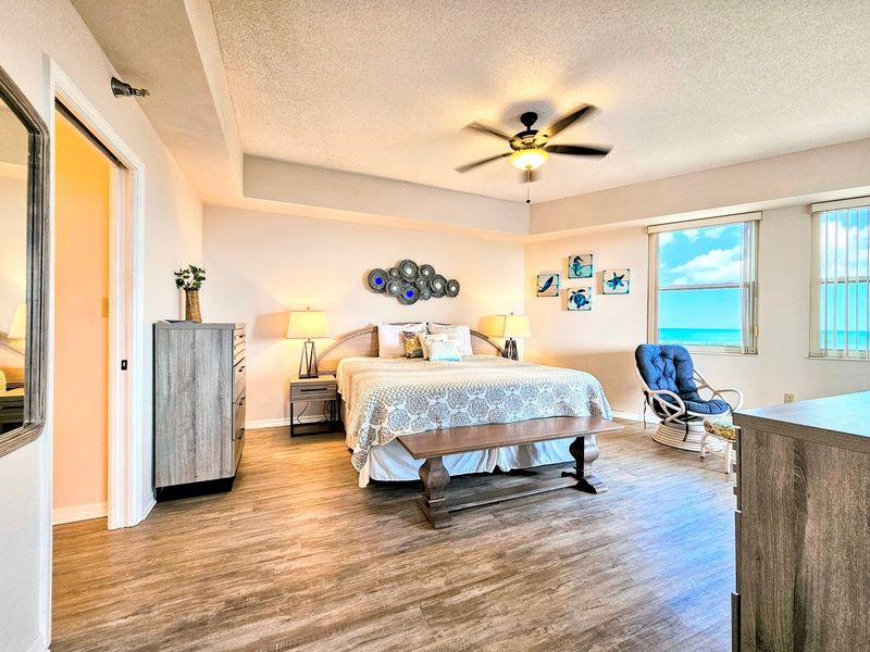The master bedroom serves as a sanctuary of tranquility, featuring a plush King bed, a large window framing mesmerizing ocean views, and a sliding glass door leading to the balcony. Indulge in the master en-suite bathroom, complete with a double vanity, glass-enclosed shower, soaking tub, and complimentary toiletries. In the guest bedroom, you'll find a cozy queen bed. The sofa also pulls out to a queen sleeper.