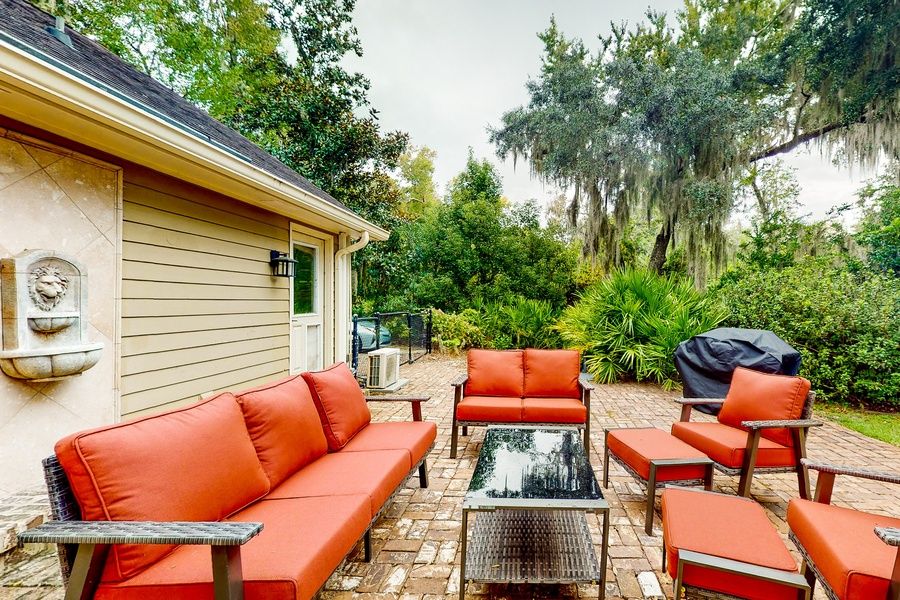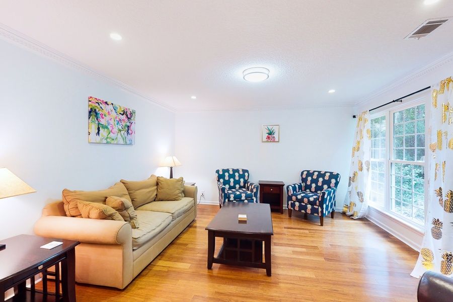 This is the perfect place to stay if you want to enjoy all St. Simons Island offers. Sea Palms Golf Course is nearby, along with plenty of other public golf courses if you're looking to tee off. Several beaches, including East Beach, are less than five miles away, so you can easily spend a day lounging on the sand and soaking up the sun. Enjoy cooking out on the backyard grill, taking in the expansive backyard space while the kids run around. This incredibly spacious home is perfect for groups looking to get away. Multiple outdoor sitting areas allow everyone to relax, and you can bring the fun inside to the comfortably furnished living room. Central air-conditioning ensures that everyone will rest with ease no matter what season you choose to make the trip. If you want to make side dishes for your cookout, the well-equipped full kitchen features plenty of cooking space and a wine fridge for storing refreshments. The main bedroom is set close to the living room and features a deluxe closet and en suite bathroom. The three upstairs bedrooms have direct access to the private deck so that you can admire the tranquil views into the backyard greenery first thing in the morning. A nearby desk workspace upstairs is perfect for completing remote work assignments. Extra touches include a private washer/dryer and a casual lounge with pineapple-themed decor. Come prepared to relax - you'll find it easy at this home! THINGS TO KNOW.