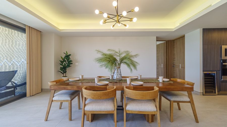 Main room with twin sofas and TV in the den area. A dining table for six. Kitchen with large island stainless appliances, and many small appliances as well