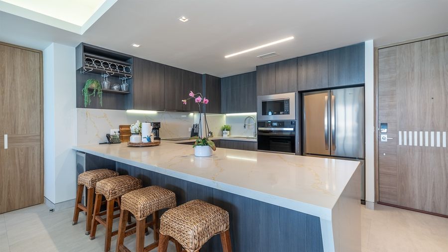 This condo presents a spacious bedroom suite where you can close the door and leave the world behind. An extra comfortable king sized is matched with a chair and ottoman, wall mounted TV, and a connected complete bathroom. The twin sink vanity is crowned with custom lighting and fixtures, and a separate walk in closet really sets this space apart. The walk in shower is large and elegant.