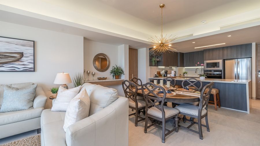 The living room offers double sofas and a wall mounted TV. A comfortable chair and ottoman sit near the balcony access sliding glass doors. Enjoy out of this world views for the balcony, set with a raised dining table for four, and intimate padded chairs as well.