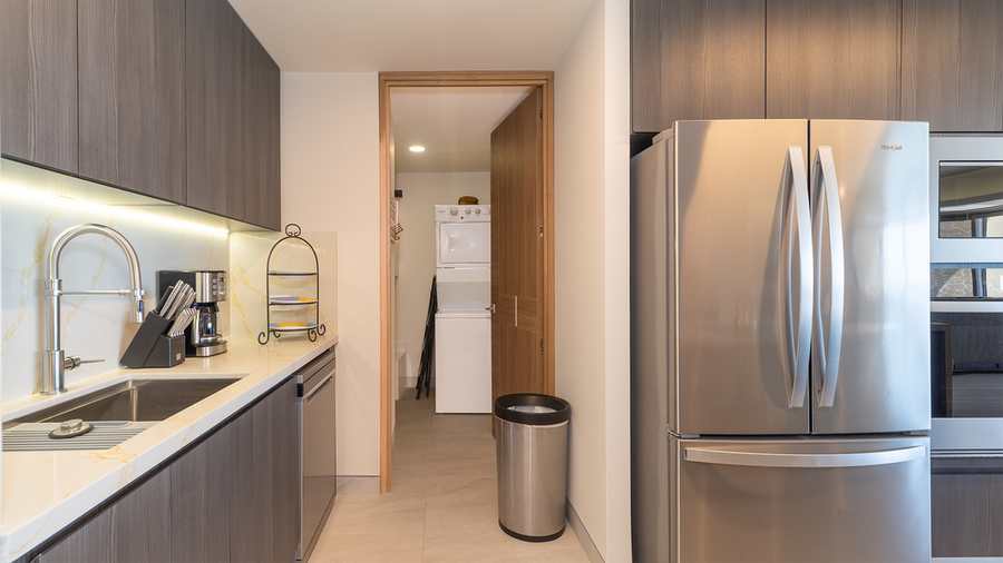 The master bedroom has a king bed, and its own bathroom with shower, vanity, and walk-in closet. The guest bedroom has a king bed, closets and attached private bathroom. The third bedroom is a large hotel room style space with its own bathroom, and a kitchenette with microwave and refrigerator, and a private balcony.
