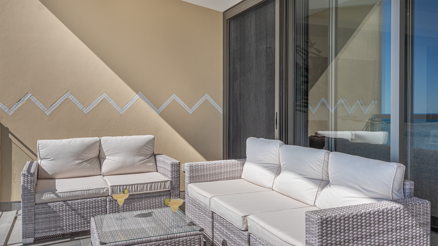 The private balcony is an excellent space to enjoy breathtaking views of the beach, and ocean beyond.