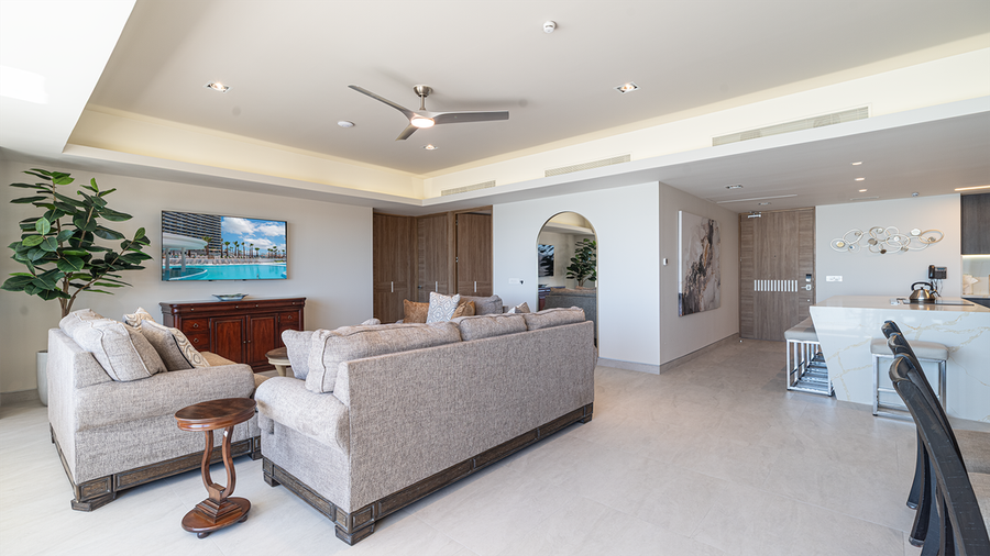 Complete condominium with three bedrooms at the Sonoran Star Resort, the newest in Rocky Point. The main room is truly grand, presenting a large dining table , cozy living room groom den area with TV, and a wall of windows facing the Sea of Cortez. The bacon is fully furnished and inviting. The kitchen centers around a large island with counter top stove, and bar stool seating. All large and small appliances are provide, and a washer and dryer are set in separate room as well.