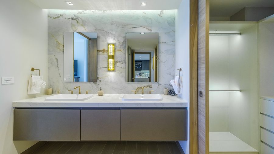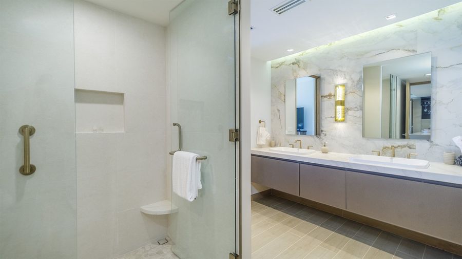 - The bathroom presents a luxurious twin sink vanity, topped with mirrors