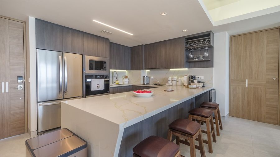 - Large kitchen bound by a large counter top. There are numerous bar stools set here.